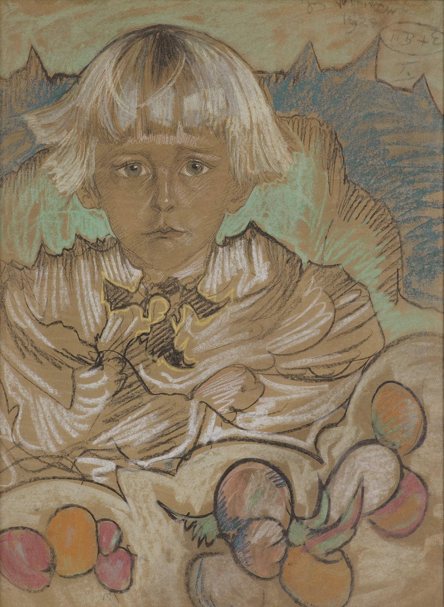 Portret przedstawia małego Tomasza Domaniewskiego (ur. 1920), zwanego Tomciem. Wprawdzie poważna twarzyczka lekko przestraszonego dziecka została narysowana bardzo starannie, w konwencji realistycznej, jednak jego ubiór oraz otoczenie – leżące przed nim owoce i łańcuch szczyt...