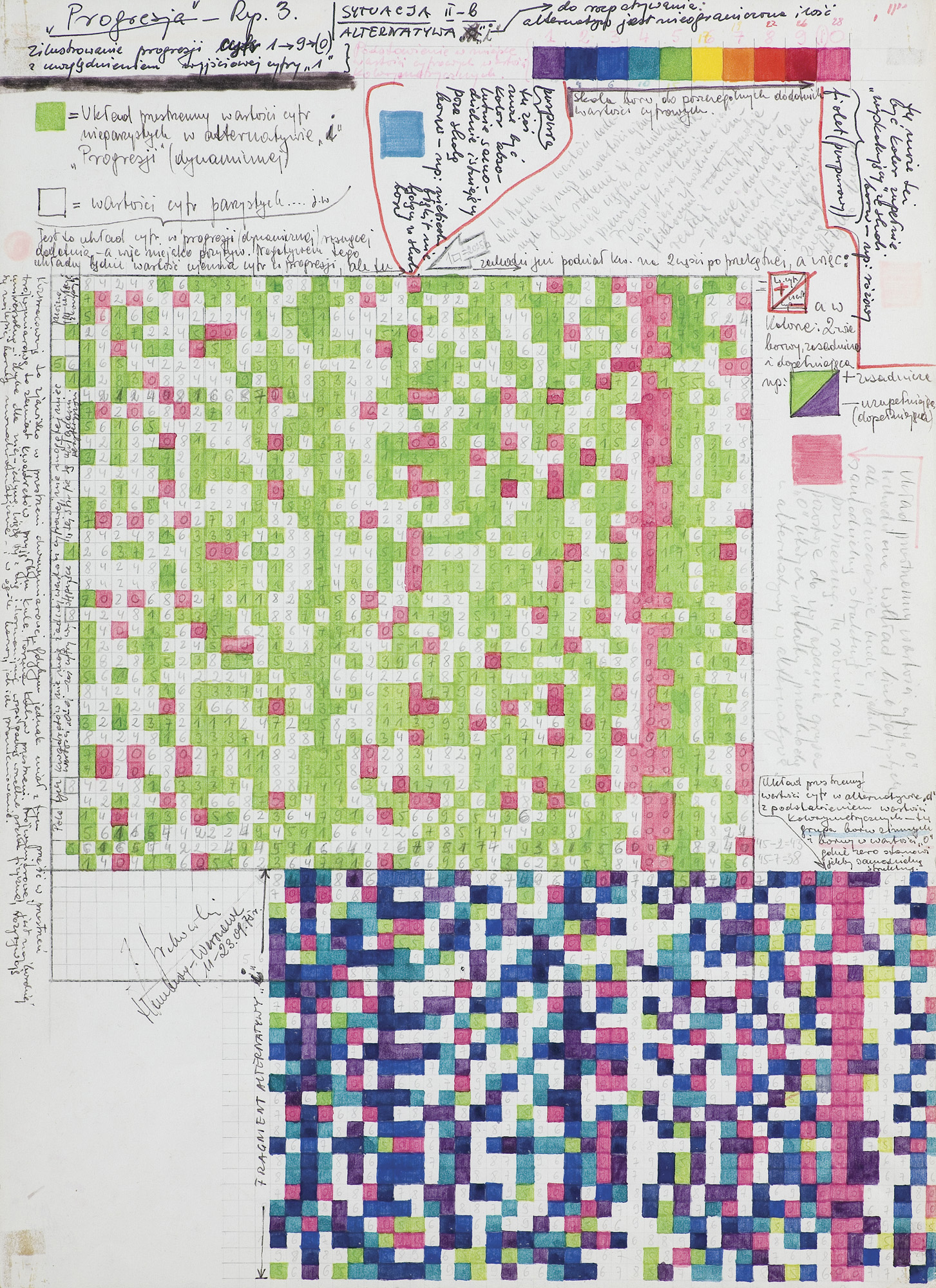 Jerzy Grabowski (ur. Gutki koło Łomży 26.IX.1933) w latach 1953-1962 studiował początkowo na Wydziale Architektury Politechniki we Wrocławiu, następnie na Wydziale Grafiki ASP w Warszawie. Dyplom w pracowni prof. Józefa Mroszczaka. Od roku 1976 był pedagogiem w PWSSP w Łodzi prowadząc pracownię druków płaskich. Od roku 1993 wykładał w Europejskiej Akademi Sztuk w Warszawie. Juror międzynarodowych biennale i konkursów, członek Międzynarodowego Stowarzyszenia Drzeworytników XYLON. Uprawiał malarstwo, grafikę artystyczną i użytkową oraz rysunek. Jego twórczość oparta jest na strukturach matematycznych. Matematyka stanowiła dla niego istotny punkt odniesienia,wykorzystywał też zjawiska iluzji wzrokowej. Najczęściej występującą formą jest trójkąt przyjęty jako najprostsza a zarazem najdoskonalsza figura, zaś system barw podporządkowany jest wartościom cyfrowym. Struktury kompozycji są otwarte, wykraczające daleko poza ramy obrazu, rozciągające się do nieskończoności. Artysta miał ponad 40 wystaw indywidualnych w kraju i za granicą. Ważniejsze nagrody; 1974 - Medal Brązowy na 13 Międzynarodowym Konkursie Rysunku im. Joan`a Miro w Barcelonie, 1979 Grand Prix - 2 Quadriennale Drzeworytu i Linorytu Polskiego w Olsztynie, 1999 - Złoty Medal - 12 Norweskie Międzynarodowe Triennale Grafiki, Fredrikstadt.