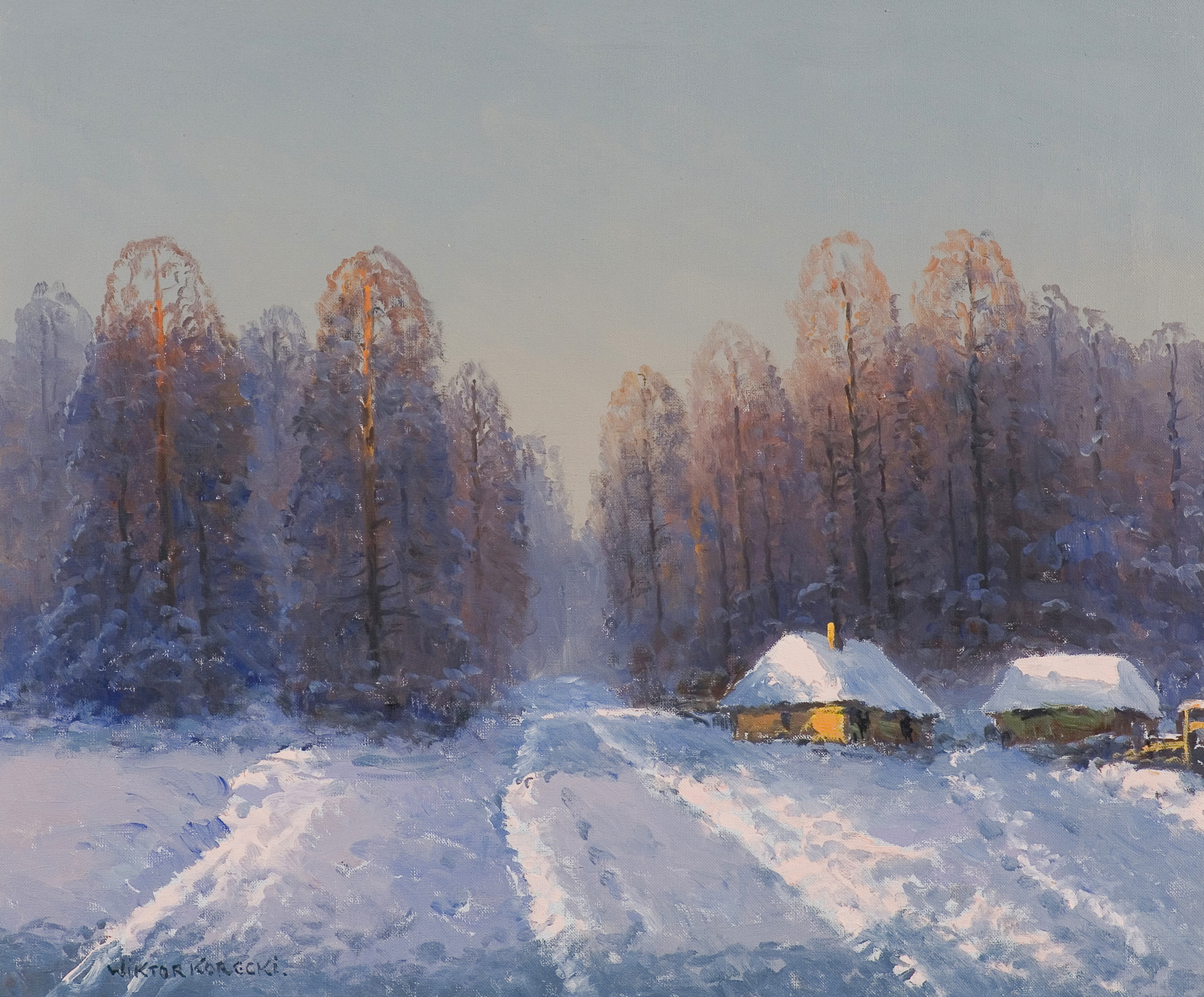Wiktor Korecki (Kamieniec Podolski 1890 - Komorów k. Warszawy 1980) - malarz pejzażysta - gimnazjum ukończył w Kijowie, tam też studiował w Szkole Rysunkowej Aleksandra Muraszki. Po studiach wrócił do Kamieńca Podolskiego, skąd w roku 1921 wyjechał do Warszawy. Tu miał pracownię na rogu ulic Tamki i Cichej. Niestety zgromadzone tam obrazy spłonęły w czasie powstania 1944 roku. Po powstaniu artysta przebywał w obozie w Pruszkowie skąd trafił do obozu pracy w Lipsku. Do kraju powrócił w roku 1946 i zamieszkał w Komorowie pod Warszawą, a później w Milanówku. Jego nastrojowe krajobrazy emanujące spokojem i pogodą cieszyły się zawsze dużą popularnością. Korecki najczęściej malował pejzaże zimowe z motywem leśnej drogi i strumienia wijącego się wśród śniegów, a obok nich także wiosenne, letnie czy jesienne widoki z Mazowsza.