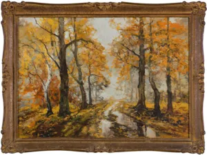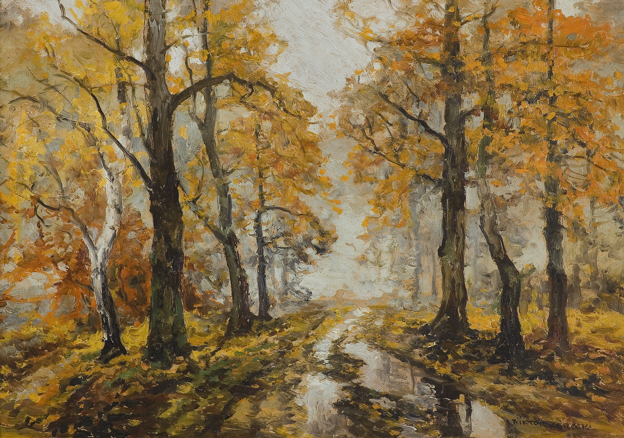 Wiktor Korecki (Kamieniec Podolski 1890 - Komorów k. Warszawy 1980) - malarz pejzażysta - gimnazjum ukończył w Kijowie, tam też studiował w Szkole Rysunkowej Aleksandra Muraszki. Po studiach wrócił do Kamieńca Podolskiego, skąd w roku 1921 wyjechał do Warszawy. Tu miał pracownię na rogu ulic Tamki i Cichej. Niestety zgromadzone tam obrazy spłonęły w czasie powstania 1944 roku. Po powstaniu artysta przebywał w obozie w Pruszkowie skąd trafił do obozu pracy w Lipsku. Do kraju powrócił w roku 1946 i zamieszkał w Komorowie pod Warszawą, a później w Milanówku. Jego nastrojowe krajobrazy emanujące spokojem i pogodą cieszyły się zawsze dużą popularnością. Korecki najczęściej malował pejzaże zimowe z motywem leśnej drogi i strumienia wijącego się wśród śniegów, a obok nich także wiosenne, letnie czy jesienne widoki z Mazowsza.