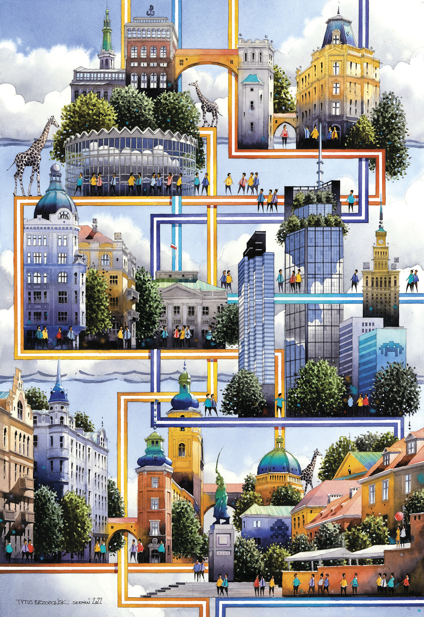 Tytus Brzozowski (Warszawa 1984, mieszka w Warszawie) - ukończył Wydział Architektury Politechniki Warszawskiej, jest akwarelistą i architektem zafascynowanym duszą miasta. Często zestawia sylwetki gmachów i ludzi, tworząc barwne, pogodne sceny z pogranicza rzeczywistości i fantastyki. Jego ulubioną bohaterką jest Warszawa. Pomimo surrealistycznego posmaku, obrazy związane są z prawdziwą historią polskich miast. Artysta niekiedy wychodzi poza sferę akwareli, tak jak zrobił to na potrzeby projektów sześciu warszawskich murali, wielkoformatowej książki obrazkowej Miastonauci, a także pejzaży zrujnowanej stolicy do filmu Po apokalipsie.