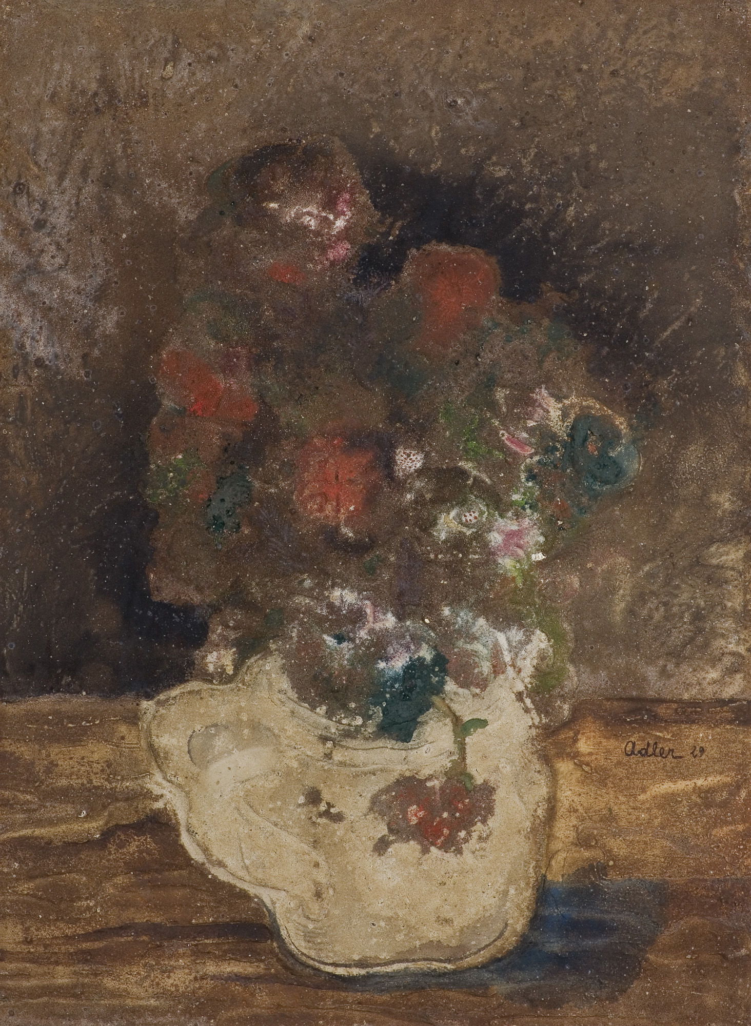 Jankiel Adler pochodził z rodziny chasydzkiej. Studia artystyczne rozpoczął w Polsce. W 1912 był w Jugosławii, gdzie uczył się zawodu grawera, następnie (do 1918) kształcił się pod kierunkiem Gustawa Wiethüchtera w Kunstgewerbeschule w Barmen k. Düsseldorfu. W latach 1918-1920 przebywał w Warszawie i współpracował z grupą artystów żydowskich Jung Idysz. Namalował wówczas cykl ekspresjonistycznych, symbolicznych obrazów zainspirowanych sztukę El Greca i tradycją żydowską (Ostatnia godzina rabbiego). W 1920 wyjechał do Berlina, a następnie do Düsseldorfu, gdzie w 1926 wykonał malowidła w Instytucie Astronomicznym. Pod wpływem kubizmu malował wówczas stylizowane kompozycje figuralne. Wprowadzał mocny kontur określający formy i stosował zróżnicowaną, niemal reliefową fakturę, uzyskiwaną poprzez mieszanie farb z piaskiem, solą, gipsem czy woskiem. Po podróży na Majorkę i do Hiszpanii w latach 1929-1930 w jego twórczości nasiliły się tendencje do abstrakcji. W 1931 miał pracownię w Akademii Sztuk Pięknych w Düsseldorfie i wówczas nawiązał kontakt z Paulem Klee. W 1933 ze względów politycznych opuścił Niemcy, przenosząc się do Paryża. W 1925-1926 był w Polsce, później ponownie w Paryżu i w Cagnes-sur-Mer, gdzie mieszkał aż do wybuchu wojny. W 1940 wstąpił do formującej się we Francji armii polskiej. Przeniesiony wraz z odziałem do Szkocji, w 1941 został zdemobilizowany ze względu na stan zdrowia. Od 1943 mieszkał w Londynie i podlondyńskim Aldbourne. Po 1941 malował obrazy o mocniejszym kolorycie i monumentalnej formie budowanej na sposób kubistyczny. Obok dawnych tematów zaczerpniętych z żydowskiego folkloru, Biblii i Talmudu (Starzy rabini, Król Dawid), martwych natur, zwierząt itp. malował wówczas także obrazy o tematyce wojennej martyrologii Żydów (Treblinka, Inwalidzi, Zniszczenie). Obok malarstwa olejnego Adler zajmował się też akwarelą, rysunkiem i grafiką. Miał liczne wystawy indywidualne, m.in. w Łodzi (1918), Warszawie (1920, 1935), Wrocławiu (1931), Londynie (1946, 1948), Nowym Jorku (1948). Brał także udział w wielu wystawach zbiorowych, m.in. w 1933 w międzynarodowej wystawie w Nowym Jorku.