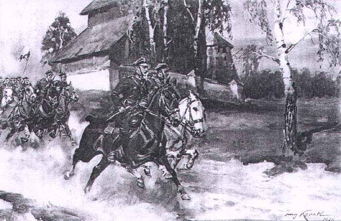 Jerzy Kossak (Kraków 1886 - Kraków 1955)- syn Wojciecha, wnuk Juliusza Kossaków - od wczesnego dzieciństwa malował pod kierunkiem ojca i dziadka. Kontynuator i naśladowca ich sztuki tworzył sceny batalistyczne, historyczne i rodzajowe z wszechobecnym motywem konia. Malował obrazy z powstania listopadowego, wojen napoleońskich oraz wiele scen z wojny 1920 roku. Najbardziej znaną jego kompozycją tego rodzaju był Cud nad Wisłą. Malował też liczne Pogonie i Pościgi ułanów za kozakami, Napady wilków, Polowania i Wesela. Tematyka tych prac sprawia, że stale cieszą się zainteresowaniem zbieraczy i publiczności, zawsze tłumnie odwiedzającej wystawy malarstwa Kossaków.