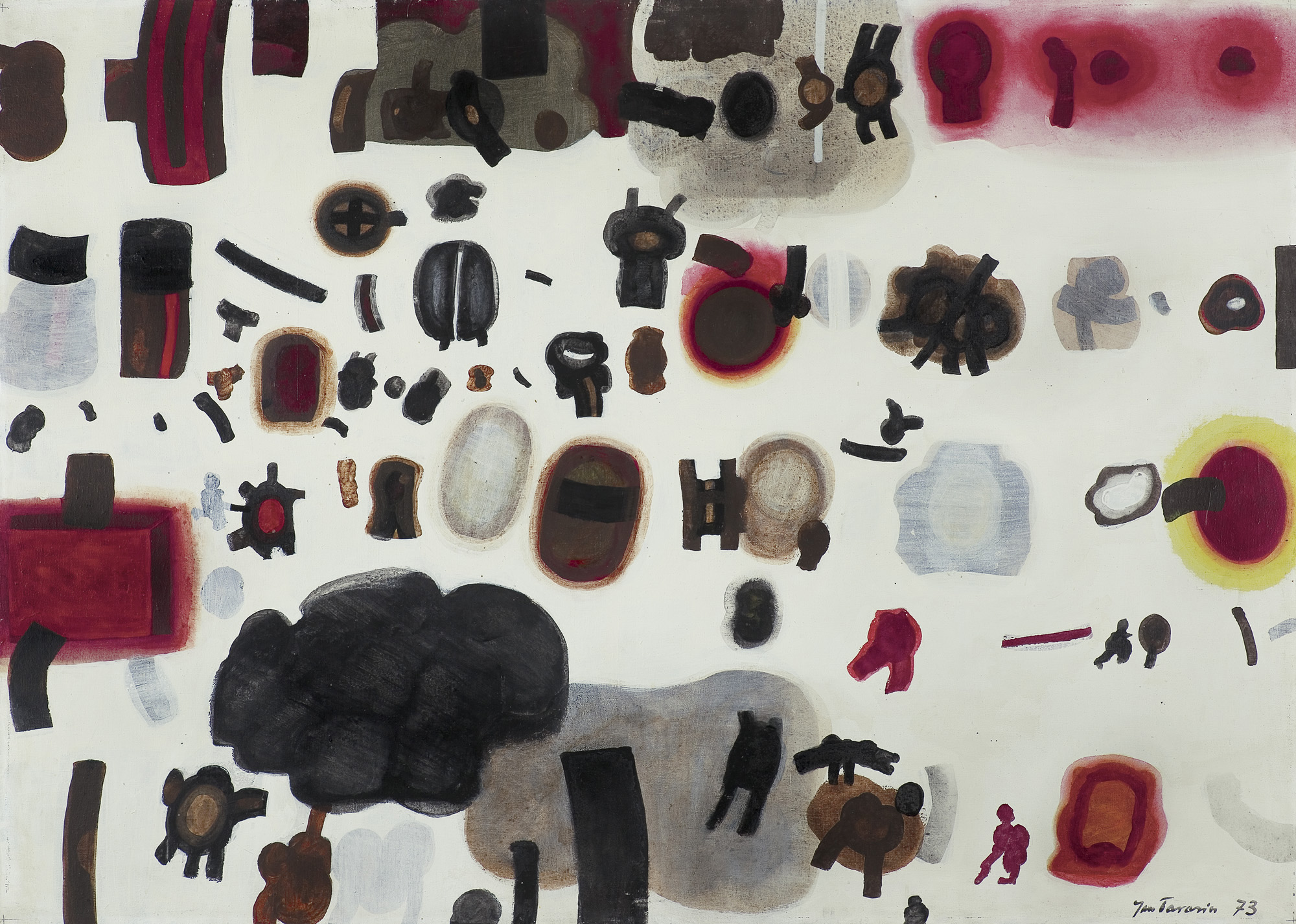 Jan Tarasin (Kalisz 11 IX 1926 - Warszawa 8 VIII 2009) studiował malarstwo w ASP w Krakowie pod kierunkiem prof. Zbigniewa Pronaszki (1946-1951). Jeszcze jako student zadebiutował na I Wystawie Sztuki Nowoczesnej w Krakowie w 1948/49. W połowie lat 50. stworzył cykle litografii: „Nowa Huta i jej mieszkańcy“, 1954, „Dom“, 1955). W pierwszym przeciwstawił się oficjalnemu optymizmowi, w drugim, operując symboliką martwej natury, zawarł treści egzystencjalne i odnoszące do niedawnego dramatu wojny. Po 1956 zaczął malować obrazy niefiguratywne. Układy wyodrębnionych elementów (określanych jako „przedmioty“) umieszczane były przez artystę na płaszczyźnie (cykl „Wnętrze“, 1957) ), lub w aluzyjnej przestrzeni (cykle „Uczta“, 1957, „Brzeg“, 1962-1964, „Przedmioty policzone“, od 1968, „Antykwariat“, 1968). Zasada ta utrzymuje się w jego malarstwie w następnych latach, różnice między okresami twórczości dotyczą sposobu opracowania „przedmiotów“ i ich usytuowania w przestrzeni obrazu lub wobec tła. Od lat 70. „przedmioty“ zmieniają się w graficzne, zwykle czarne znaki na jasnych tłach (cykl „Kolekcja“, od 1971). Tła z kolei bywają iluzyjnie przestrzenne, zróżnicowane walorowo, miękkie. W latach 90. artysta wrócił do kolorystycznego, bardziej malarskiego rozwiązywania zarówno znaków, jak i teł, często ciemnych lub przenikających się z „przedmiotami“ (cykl „Wylęgarnia przedmiotów“, 1992). Tarasin od 1962 jest członkiem „Grupy Krakowskiej“. W 1963-67 uczył na Wydziale Architektury Wnętrz krakowskiej ASP. W 1967 przeniósł się do Warszawy, w 1974 podjął pracę pedagogiczną na Wydziale Malarstwa ASP w Warszawie. W 1987-90 był rektorem tej uczelni. W 1976 otrzymał Nagrodę Krytyki Artystycznej im. Cypriana Kamila Norwida, w 1984 Nagrodę im. Jana Cybisa.; Nagroda na MB Sztuki w San Marino 1965. Równolegle z malarstwem zajmował się rysunkiem i grafiką - do lat 60. litografią, od 1974 serigrafią. W 1974-1981 wydał 8 autorskich „Zeszytów“ z serigrafiami i własnymi tekstami. W 1995 w Galerii Zachęta odbyła się wystawa artysty, której towarzyszył monograficzny katalog.