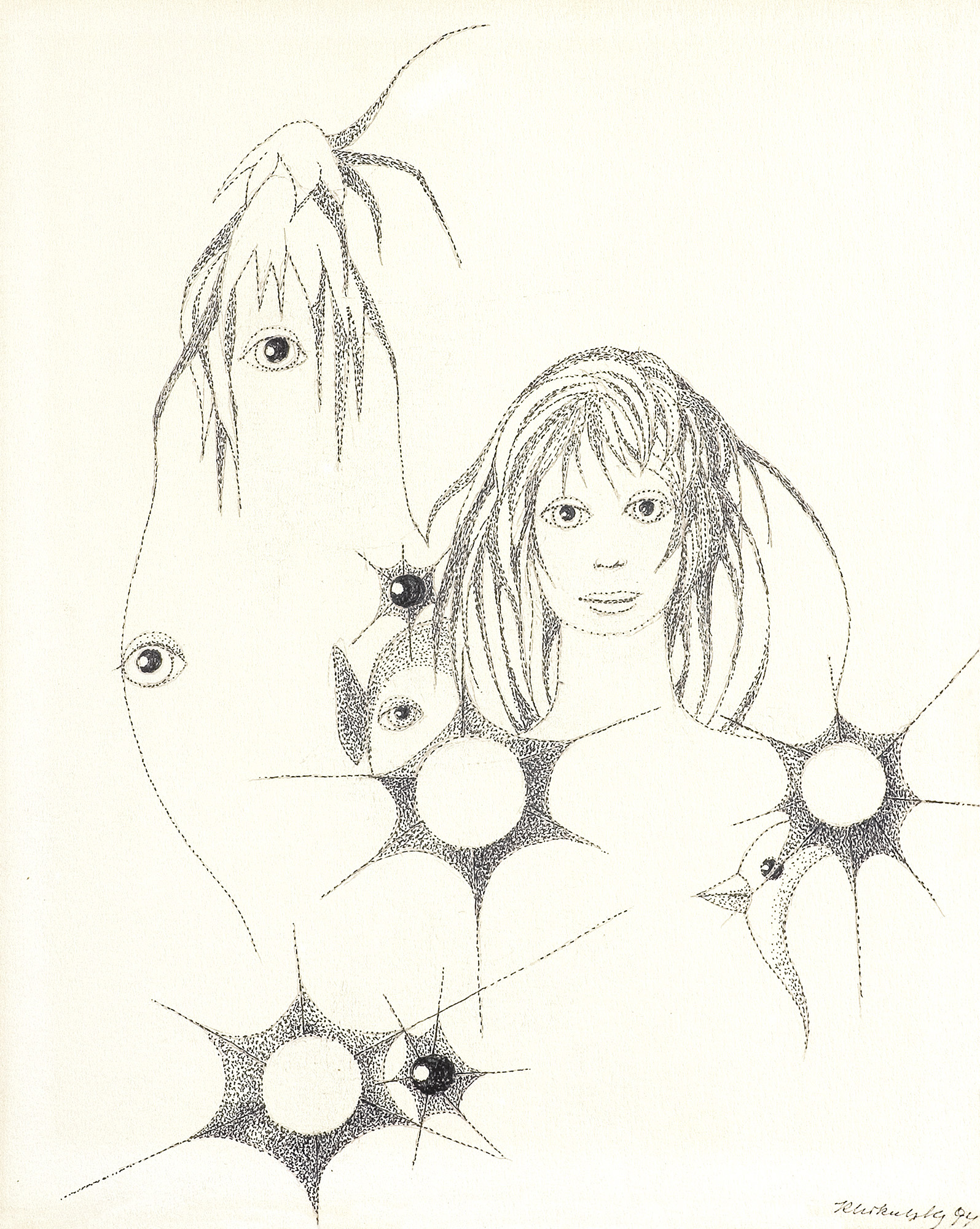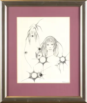 Kazimierz Mikulski (Kraków 1918 - Kraków 1998) rozpoczął studia malarskie przed II wojną światową w ASP w Krakowie, kontynuował je w latach 1939-1940 pod kierunkiem prof. Fryderyka Pautscha w Kunstgewerbeschule, powstałej za okupacji w miejsce Akademii. Po wojnie ukończył dwuletnie studia aktorskie w Studio Dramatycznym przy Starym Teatrze w Krakowie i do 1948 pracował jako aktor. Jednocześnie w 1945 ukończył Warsztat Filmowy Młodych. W latach 1948-1979 był kierownikiem plastycznym i scenografem Teatru Groteska w Krakowie, dla którego projektował lalki, kostiumy, dekoracje itp. Równolegle cały czas zajmował się malarstwem i działalnością w kręgu Tadeusza Kantora, zrazu jako członek Gru-py Młodych Plastyków, a od 1957 w Grupie Krakowskiej, której był współzałożycielem i prezesem w latach 1965-1967. Był też członkiem zespołu teatru Cricot 2, grał m.in. w spektaklach Kurka wodna, Nadobnisie i koczkodany, Umarła klasa oraz we własnej sztuce Cyrk. W swych obrazach z drugiej poł. lat 40. artysta przedstawiał lekkie, linearne formy unoszące się w pustych przestrzeniach. Było to malarstwo zarazem surrealistyczne i abstrakcyjne. Lecz już ok. 1950 zaczął malować w charaktery-styczny dlań sposób - odrzucając abstrakcję, prezentował niezliczone warianty i układy kilku ulubionych motywów (głowa lub postać kobiety-lalki, koty, motyle).