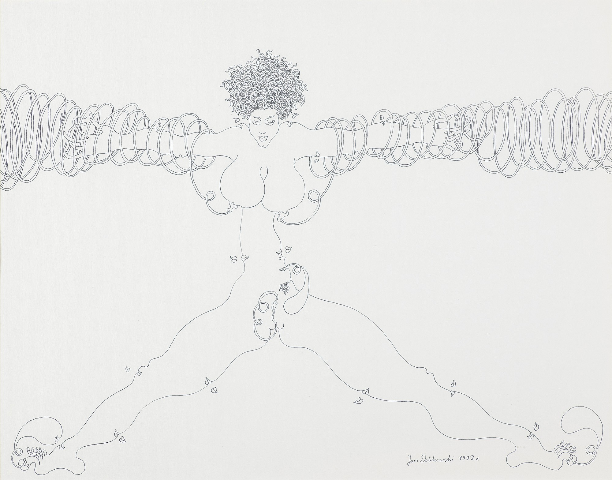 Jan Dobkowski (Łomża 1942, mieszka w Warszawie) studiował w latach 1962-1968 na Wydziale Malarstwa warszawskiej ASP pod kierunkiem prof. Juliusza Studnickiego i Jana Cybisa. Będąc jeszcze na studiach, w 1966, utworzył duet artystyczny, w którym jego partnerem był Jerzy (Jurry) Zieliński. Ich pierwsza wspólna wystawa pn. Neo-Neo-Neo odbyła się w Warszawie w 1967. Wystawiali wspólnie do 1970. W 1968 powstały pierwsze zielono-czerwone obrazy Dobkowskiego (używającego w tym czasie pseudonimu Dobson). W pracach tych, operujących giętkimi, falistymi liniami, w których upatrywano wpływów secesji, artysta używał sposobów rodem z op-artu dla wywołania złudzeń optycznych (wirowanie, mżenie, pozorny ruch form). Równolegle z obrazami tworzył też formy z płyt i folii do montowania w przestrzeni. Złoty medal na Sympozjum Złotego Grona w Zielonej Górze w 1971 i blisko roczny pobyt w USA na stypendium Fundacji Kościuszkowskiej w 1972 to kolejne etapy pełnej sukcesów kariery malarza. Wyraźną zmianę nastroju i wymowy jego prac przyniosły wydarzenia 1980-1981 roku, zwłaszcza wprowadzenie stanu wojennego. Monochromatyczne, ciemne płótna znaczył wtedy nikłymi, wiotkimi liniami rysunku. Najczęstszym motywem były patriotyczne i religijne symbole, dopowiadane tytułami nawiązującymi do realiów czasu. Kolejna radykalna zmiana nastąpiła ok. 1990. Symbolicznym zwiastunem nowego okresu stał się olbrzymi, radosny, eksplodujący bogactwem barw, kształtów i ruchu obraz ...a życie sobie płynie... (394 x 588 cm) z 1990-1991. Podobne cechy formalne charakteryzują twórczość artysty w całej dekadzie lat 90. Równolegle z malarstwem Dobkowski pracuje nad rysunkiem, będącym bardzo ważnym dopełnieniem jego twórczości.