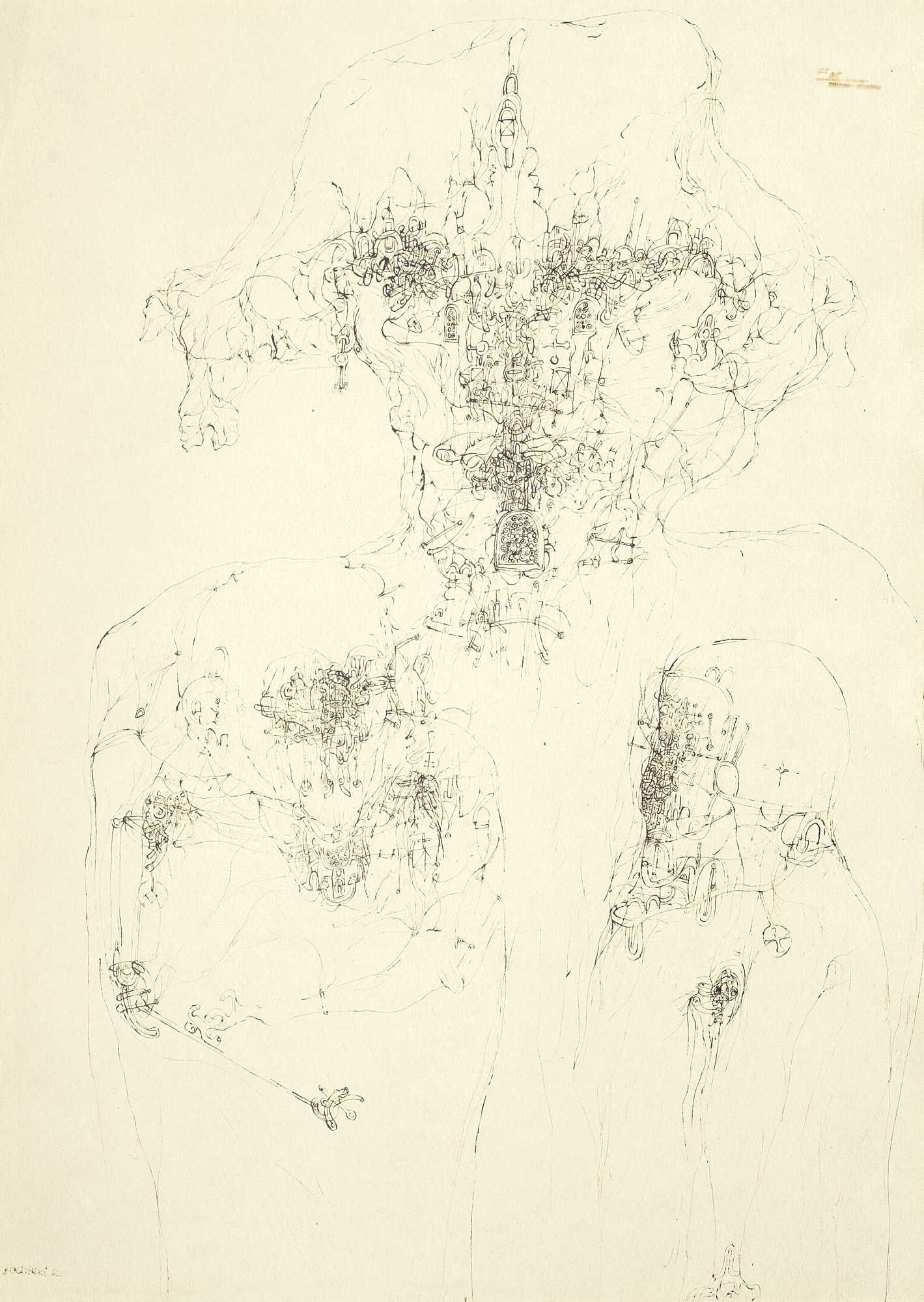 Zdzisław Beksiński (Sanok 24 II 1929 - Warszawa 21 II 2005) studiował w latach 1947-1952 na Wydziale Architektury Politechniki Krakowskiej. Był artystą samoukiem, który osiągnął niekwestionowaną pozycję w polskiej sztuce współczesnej, potwierdzoną obecnością jego prac na prestiżowych wystawach i w kolekcjach muzealnych. Początkowo zajmował się fotografią, którą interesował się od lat studenckich, po 1956 zyskując uznanie jako twórca fotogramów o estetyce opartej o efekty fakturowe. W latach 1958-1962 tworzył abstrakcyjne obrazy-reliefy o bogatej fakturze, głównie metalowe, będące odmianą malarstwa materii. Pod koniec tego okresu powstawały ażurowe formy o kształtach figur i pełnoplastyczne rzeźby w metalu. Kolejnym etapem jego twórczości były lata 1962-1974, kiedy poświęcał się głównie rysunkowi. W latach 60. rysował piórkiem i tuszem figuralne kompozycje odznaczające się karykaturalną deformacją postaci. Od końca lat 60. tworzył rysunki węglem i kredkami, będące monochromatyczną odmianą jego równoległej twórczości malarskiej. Od 1974 zajmował się niemal niepodzielnie malarstwem. Jego charakterystyczny styl bazował na perfekcji technicznej, której towarzyszyła niezwykłość wizji. Malował świat po katastrofie, naznaczony piętnem śmierci i rozpadu. Jego obrazy zaludniają postaci i stwory o ludzkich wprawdzie bądź zwierzęcych kształtach, lecz o cechach fantomów, automatów lub rozpadających się trucheł. Artysta nie nadawał swym obrazom i rysunkom tytułów (poza porządkującymi symbolami), akcentując w ten sposób swój brak zainteresowania dla literackiej strony przedstawień. Sam mówił, że malując całkowicie poddaje się wizji, „fotografuje“ ją. W ostatnich latach włączył do swego warsztatu artystycznego elektroniczne techniki generowania obrazu, które wykorzystywał do tworzenia komputerowych fotomontaży. Sztuka Beksińskiego, wielokrotnie wystawiana i omawiana, budzi skrajne emocje wśród znawców i publiczności.