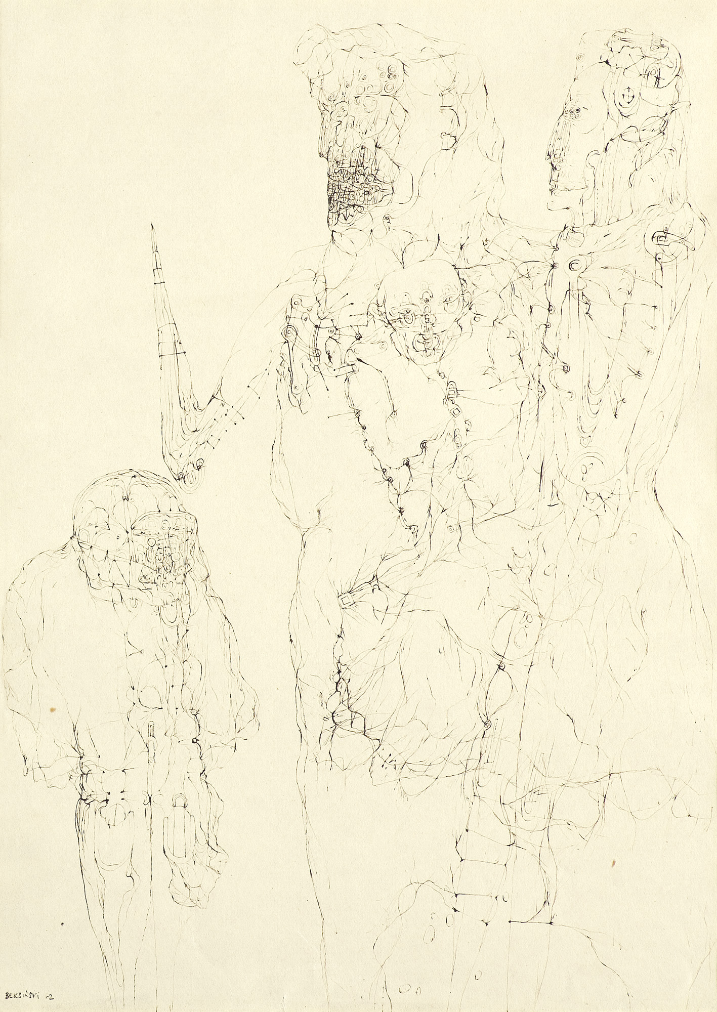 Zdzisław Beksiński (Sanok 24 II 1929 - Warszawa 21 II 2005) studiował w latach 1947-1952 na Wydziale Architektury Politechniki Krakowskiej. Był artystą samoukiem, który osiągnął niekwestionowaną pozycję w polskiej sztuce współczesnej, potwierdzoną obecnością jego prac na prestiżowych wystawach i w kolekcjach muzealnych. Początkowo zajmował się fotografią, którą interesował się od lat studenckich, po 1956 zyskując uznanie jako twórca fotogramów o estetyce opartej o efekty fakturowe. W latach 1958-1962 tworzył abstrakcyjne obrazy-reliefy o bogatej fakturze, głównie metalowe, będące odmianą malarstwa materii. Pod koniec tego okresu powstawały ażurowe formy o kształtach figur i pełnoplastyczne rzeźby w metalu. Kolejnym etapem jego twórczości były lata 1962-1974, kiedy poświęcał się głównie rysunkowi. W latach 60. rysował piórkiem i tuszem figuralne kompozycje odznaczające się karykaturalną deformacją postaci. Od końca lat 60. tworzył rysunki węglem i kredkami, będące monochromatyczną odmianą jego równoległej twórczości malarskiej. Od 1974 zajmował się niemal niepodzielnie malarstwem. Jego charakterystyczny styl bazował na perfekcji technicznej, której towarzyszyła niezwykłość wizji. Malował świat po katastrofie, naznaczony piętnem śmierci i rozpadu. Jego obrazy zaludniają postaci i stwory o ludzkich wprawdzie bądź zwierzęcych kształtach, lecz o cechach fantomów, automatów lub rozpadających się trucheł. Artysta nie nadawał swym obrazom i rysunkom tytułów (poza porządkującymi symbolami), akcentując w ten sposób swój brak zainteresowania dla literackiej strony przedstawień. Sam mówił, że malując całkowicie poddaje się wizji, „fotografuje“ ją. W ostatnich latach włączył do swego warsztatu artystycznego elektroniczne techniki generowania obrazu, które wykorzystywał do tworzenia komputerowych fotomontaży. Sztuka Beksińskiego, wielokrotnie wystawiana i omawiana, budzi skrajne emocje wśród znawców i publiczności.