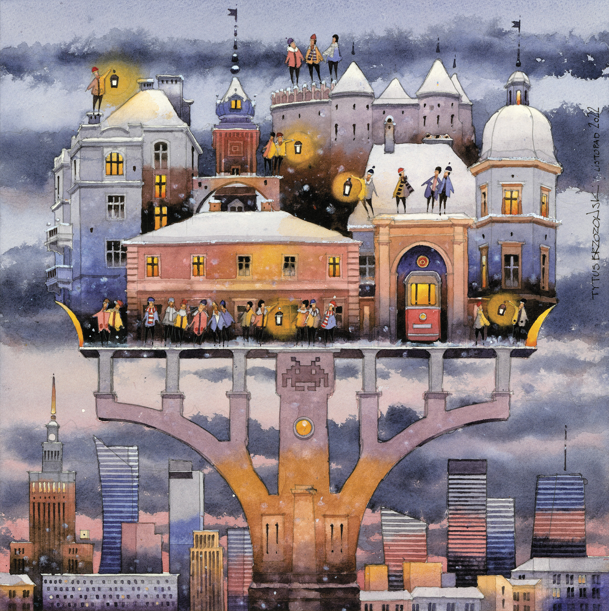 Tytus Brzozowski (Warszawa 1984, mieszka w Warszawie) - ukończył Wydział Architektury Politechniki Warszawskiej, jest akwarelistą i architektem zafascynowanym duszą miasta. Często zestawia sylwetki gmachów i ludzi, tworząc barwne, pogodne sceny z pogranicza rzeczywistości i fantastyki. Jego ulubioną bohaterką jest Warszawa. Pomimo surrealistycznego posmaku, obrazy związane są z prawdziwą historią polskich miast. Artysta niekiedy wychodzi poza sferę akwareli, tak jak zrobił to na potrzeby projektów sześciu warszawskich murali, wielkoformatowej książki obrazkowej Miastonauci, a także pejzaży zrujnowanej stolicy do filmu Po apokalipsie.