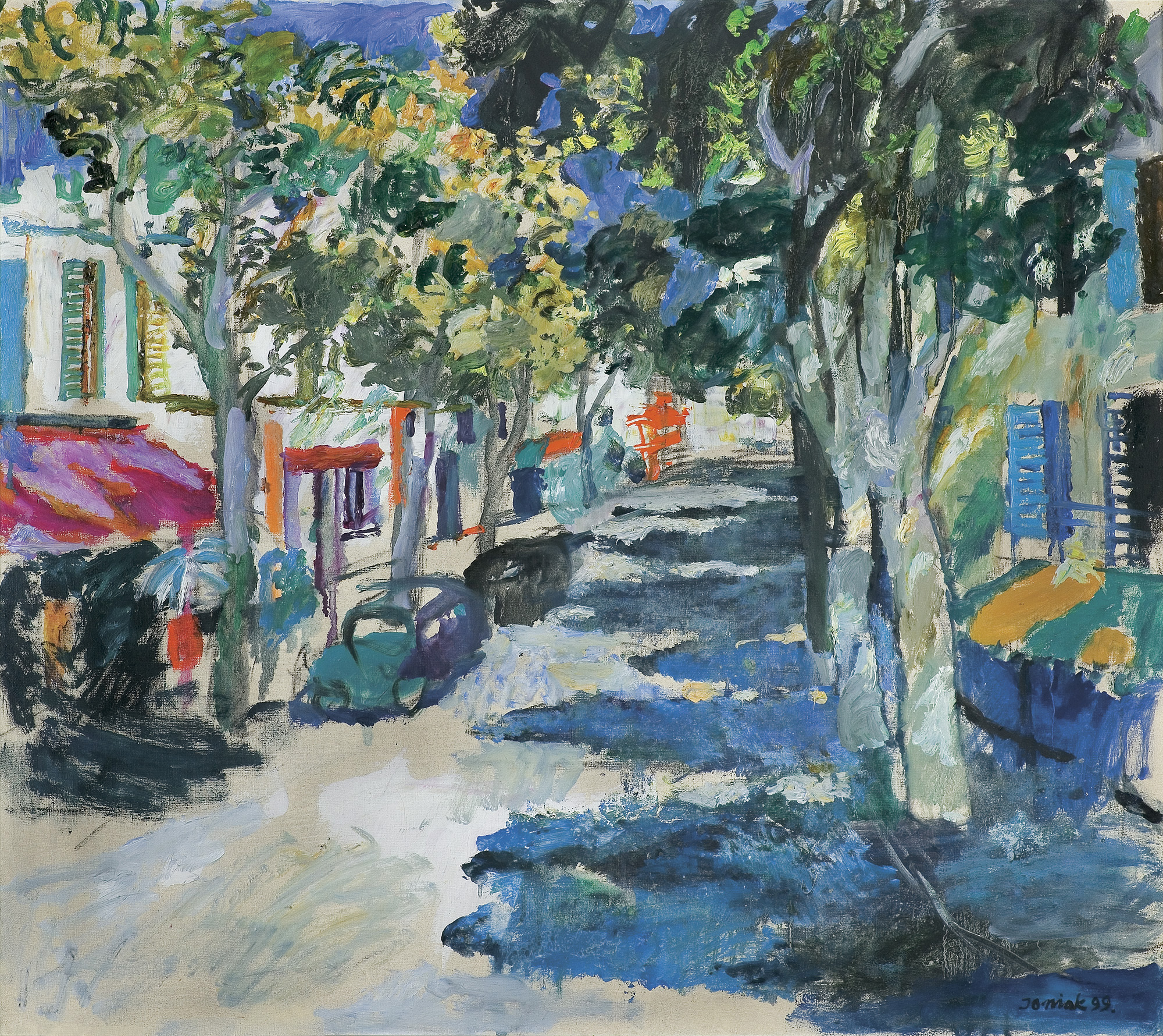 Juliusz Joniak (Lwów 19 XI 1925 - Kraków 2021) studiował w latach 1945-1949 na Wydziale Malarstwa i Grafiki Akademii Sztuk Pięknych w Krakowie pod kierunkiem Czesława Rzepińskiego i Konrada Srzednickiego. Dyplom uzyskał w 1955. Od 1950 pracuje jako pedagog w macierzystej uczelni, od 1980 był jej profesorem. W latach 1978-1981 był dziekanem Wydziału Malarstwa, a w 1981-1987 prorektorem ASP. We wczesnych latach uczestniczył w II, III i IV Ogólnopolskiej Wystawie Plastyki (1951-1954), a także w słynnej wystawie w warszawskim Arsenale (1955) i jej niemieckich edycjach pn. „Junge Generation“ w Berlinie i Lipsku (1956). W tym okresie reprezentował nurt malarstwa figuratywnego o wyraźnym rysunku i lekkich, płasko kładzionych polach koloru. W latach 60. malował tajemnicze, pełne metaforycznych odniesień Wnętrza i Martwe natury, w których chętnie eksperymentował z fakturą w duchu malarstwa materii. W kolejnej dekadzie zainteresował się kompozycjami figuralnymi (cykl „Kalejdoskop“ z przełomu lat 60. i 70.), tworząc pastisze klasycznego malarstwa z wielkich epok sztuki ("Akt z futrem wg Rubensa", 1973). Ten wątek z czasem przybrał formę monumentalnych poliptyków (seria "Karol IV z rodziną wg Goyi", 1979-1981; "Kobiety algierskie wg Delacroix", 1987). Równolegle od wczesnych lat 80. w malarstwie Joniaka dominuje pejzaż, głównie krajów południowych (Francja, Hiszpania, Włochy). Artysta czerpie swobodnie ze środków wypracowanych przez postimpresjonistów i ekspresjonistów przedwojennej Ecole de Paris, nade wszystko zaś obserwuje i zamyka w skończoną, piękną formę grę czystych kolorów w ostrym porannym świetle. Świeżość i czystość kolorów jest cechą wyróżniającą jego sztukę na tle rzeszy malarzy zafascynowanych urodą południowych plenerów. W 1995 artysta wygrał VII Festiwal Sztuki w Magné (Francja), co otworzyło mu drogę do honorowego członkostwa Académie Européenne des Arts w Paryżu.