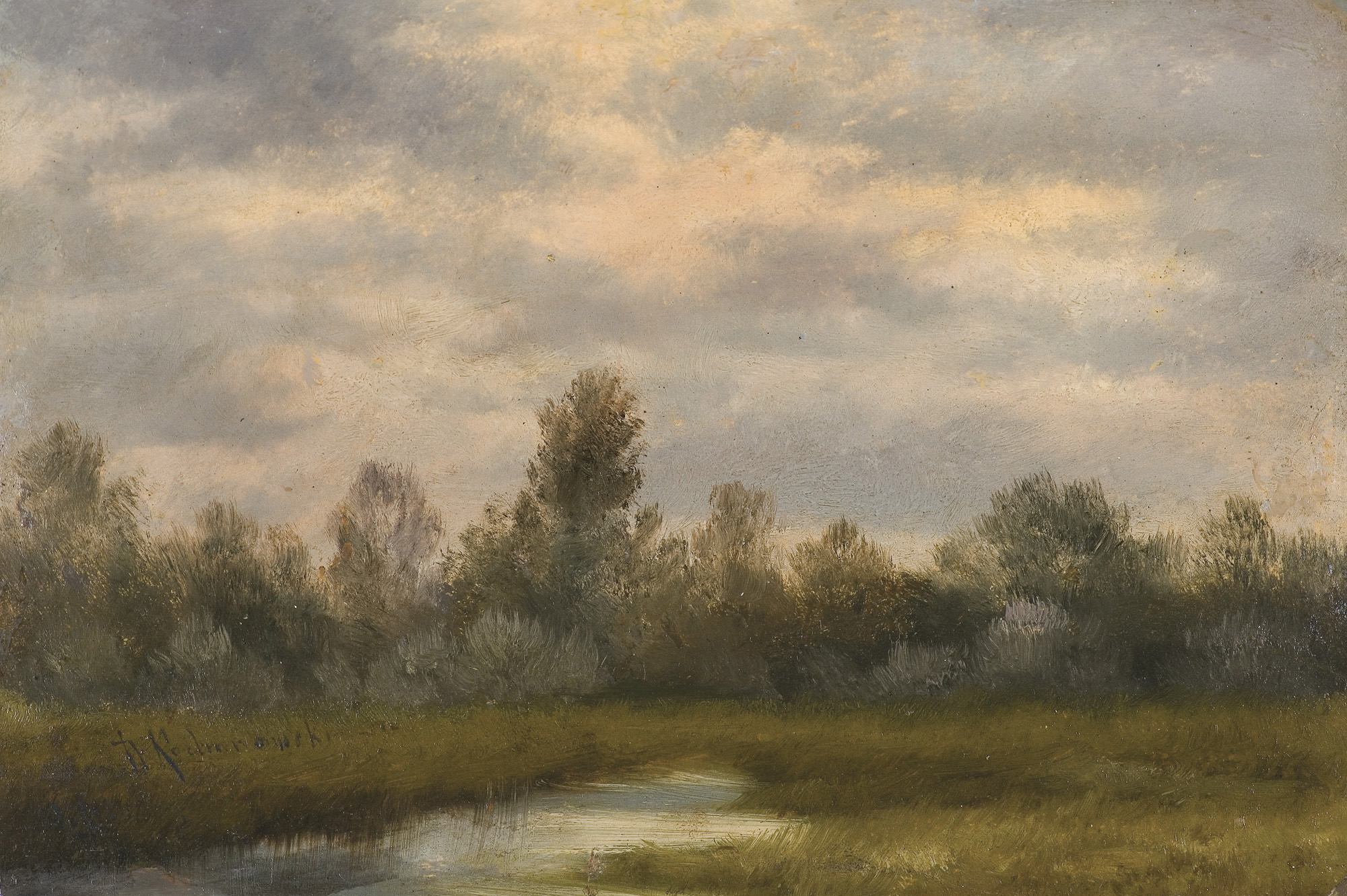 Roman Kochanowski (Kraków 1857 - Freising k. Monachium 1945) - malarz i grafik - był jednym z polskich artystów osiadłych i stałe działających w Monachium. Studia malarskie rozpoczął w Krakowie; początkowo w prywatnej pracowni Maksymiliana Cercha, a w latach 1873- 1875 w Szkole Sztuk Pięknych u Władysława Łuszczkiewicza i pejzażysty Henryka Grabińskiego. Przez następne dwa lata uczył się jeszcze na wydziale pejzażu w Akademii wiedeńskiej. W 1881 przeniósł się do Monachium, gdzie miał własną pracownię, a niebawem założył rodzinę. Często jednak przyjeżdżał do Krakowa, bywał w Poznańskiem, odbył podróż po Galicji i Podolu, rysując krajobrazy i widoki miast, które weszły następnie do albumu wydanego w Wiedniu w roku 1898. Artysta należał do monachijskiego Kunstvereinu, brał udział w wielu wystawach w Niemczech, w Wiedniu, w Londynie; swoje prace przesyłał też na pokazy krajowe. Malował przede wszystkim pejzaże a tylko z rzadka kwiaty i portrety. Stałym i ulubionym motywem jego obrazów był polski, podkrakowski krajobraz z wplecionymi weń postaciami ludzi. Obrazy artysty, malowane często na niewielkich deseczkach, pozbawione warstwy anegdotycznej odznaczają się niecodziennymi walorami malarskimi, harmonią koloru i pełnym liryzmu nastrojem. Zauważane i nagradzane na licznych wystawach były też wysoko cenione na rynku sztuki. W roku 1892, po wystawie w Wiedniu, jeden z obrazów Kochanowskiego zakupił do swoich zbiorów cesarz Franciszek Józef; dwa inne nabyli członkowie cesarskiej rodziny. Wielbicielem jego malarstwa był Karol Józef Luitpold, książę regent Bawarii. Wielka wrażliwość artysty na krajobraz i przyrodę widoczna jest także w jego rysunkach i akwafortach.