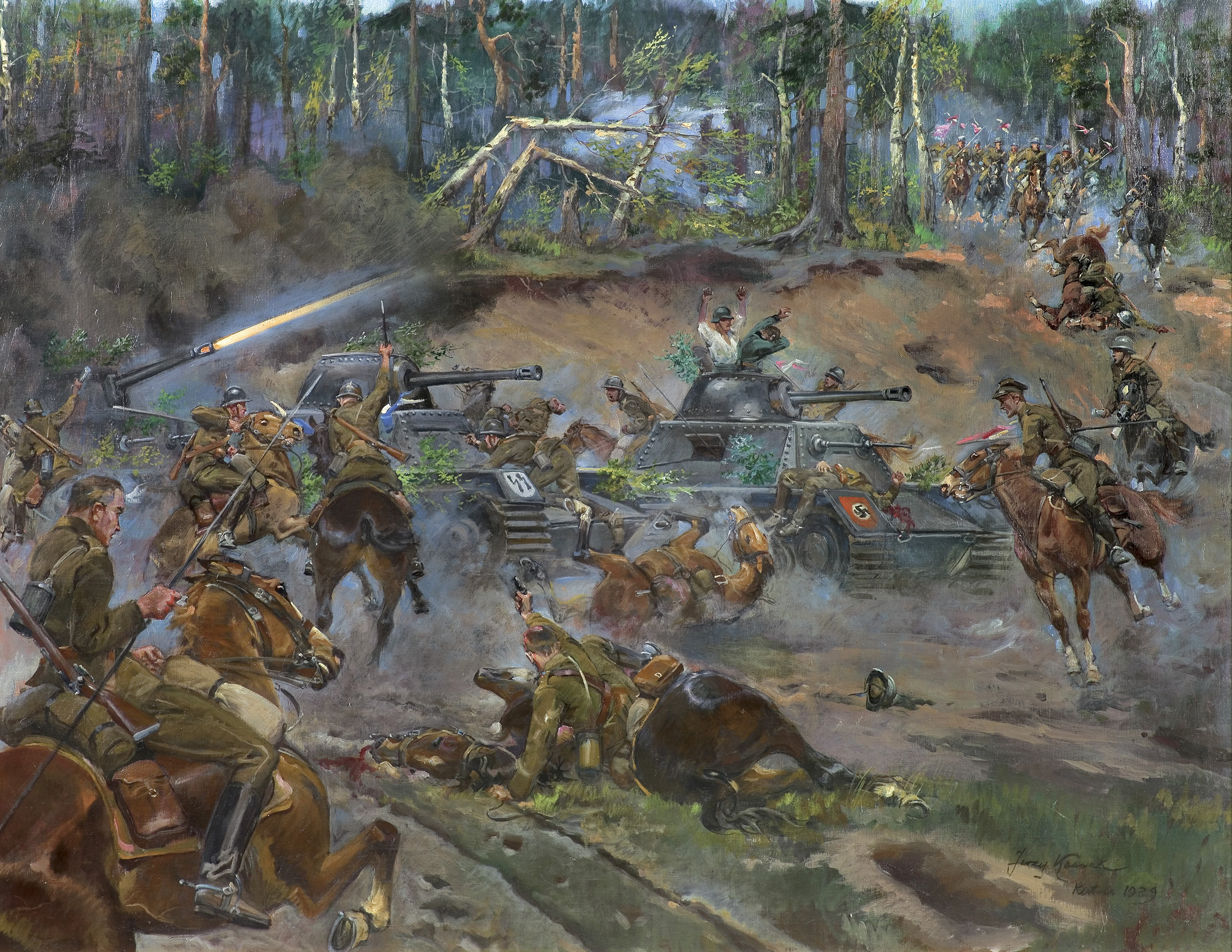 Jerzy Kossak (Kraków 1886 - Kraków 1955)- syn Wojciecha, wnuk Juliusza Kossaków - od wczesnego dzieciństwa malował pod kierunkiem ojca i dziadka. Kontynuator i naśladowca ich sztuki tworzył sceny batalistyczne, historyczne i rodzajowe z wszechobecnym motywem konia. Malował obrazy z powstania listopadowego, wojen napoleońskich oraz wiele scen z wojny 1920 roku. Najbardziej znaną jego kompozycją tego rodzaju był Cud nad Wisłą. Malował też liczne Pogonie i Pościgi ułanów za kozakami, Napady wilków, Polowania i Wesela. Tematyka tych prac sprawia, że stale cieszą się zainteresowaniem zbieraczy i publiczności, zawsze tłumnie odwiedzającej wystawy malarstwa Kossaków.