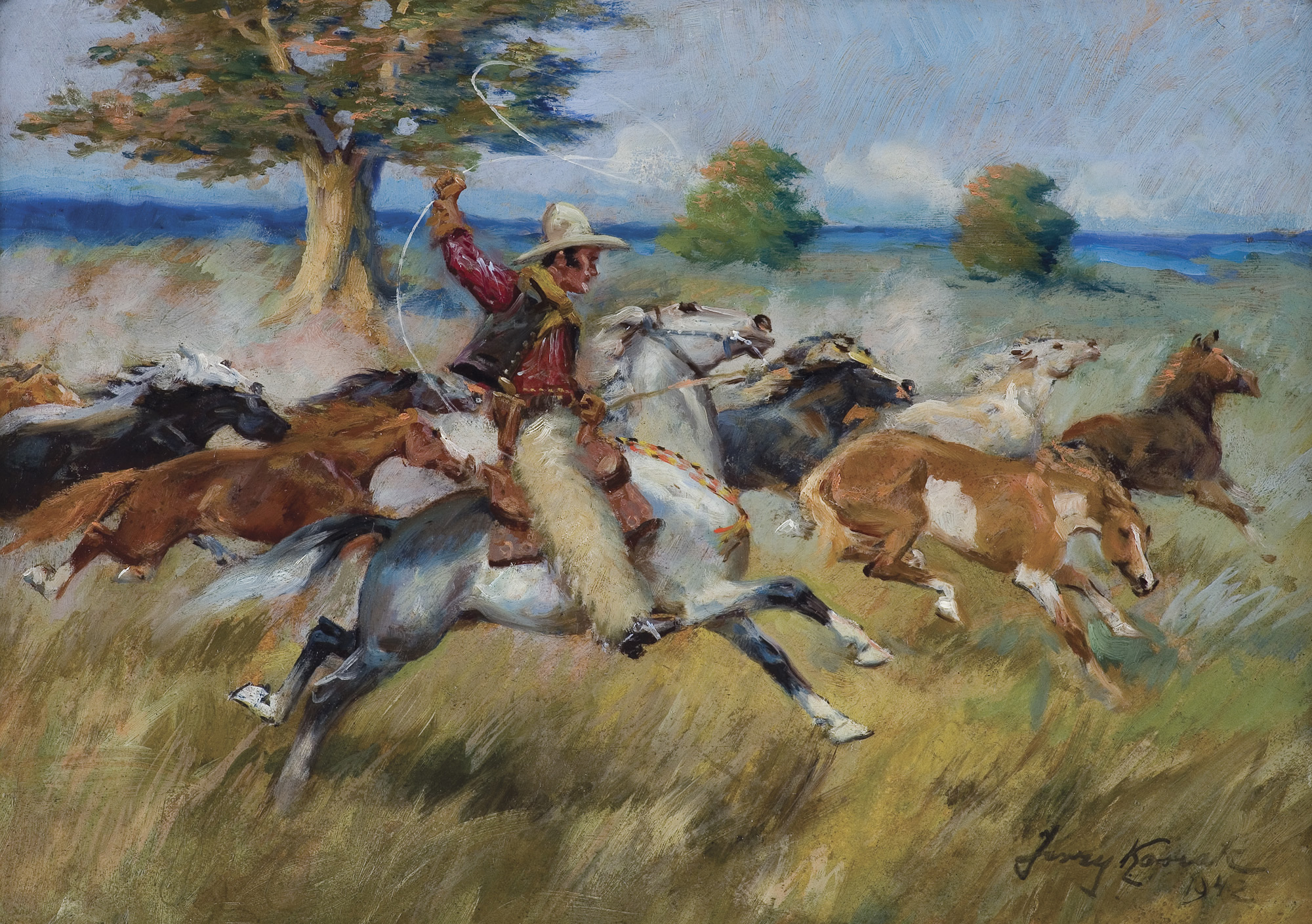 Jerzy Kossak (Kraków 1886 - Kraków 1955)- syn Wojciecha, wnuk Juliusza Kossaków - od wczesnego dzieciństwa malował pod kierunkiem ojca i dziadka. Kontynuator i naśladowca ich sztuki tworzył sceny batalistyczne, historyczne i rodzajowe z wszechobecnym motywem konia. Malował obrazy z powstania listopadowego, wojen napoleońskich oraz wiele scen z wojny 1920 roku. Najbardziej znaną jego kompozycją tego rodzaju był Cud nad Wisłą. Malował też liczne Pogonie i Pościgi ułanów za kozakami, Napady wilków, Polowania i Wesela. Tematyka tych prac sprawia, że stale cieszą się zainteresowaniem zbieraczy i publiczności, zawsze tłumnie odwiedzającej wystawy malarstwa Kossaków.