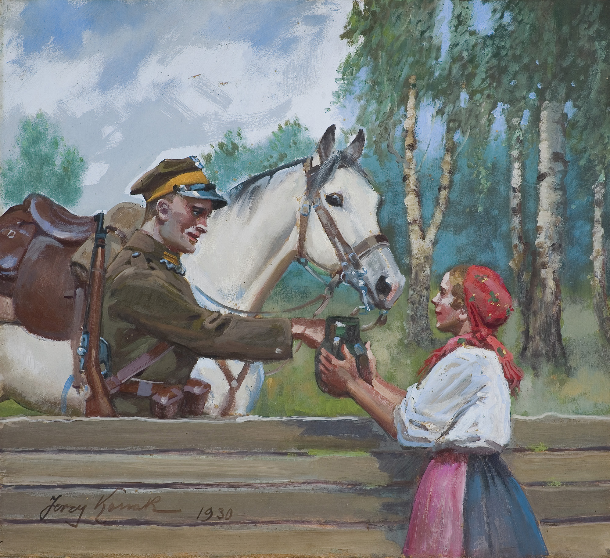 Jerzy Kossak (Kraków 1886 - Kraków 1955)- syn Wojciecha, wnuk Juliusza Kossaków - od wczesnego dzieciństwa malował pod kierunkiem ojca i dziadka. Kontynuator i naśladowca ich sztuki tworzył sceny batalistyczne, historyczne i rodzajowe z wszechobecnym motywem konia. Malował obrazy z powstania listopadowego, wojen napoleońskich oraz wiele scen z wojny 1920 roku. Najbardziej znaną jego kompozycją tego rodzaju był Cud nad Wisłą. Malował też liczne Pogonie i Pościgi ułanów za kozakami, Napady wilków, Polowania i Wesela. Tematyka tych prac sprawia, że stale cieszą się zainteresowaniem zbieraczy i publiczności, zawsze tłumnie odwiedzającej wystawy malarstwa Kossaków.