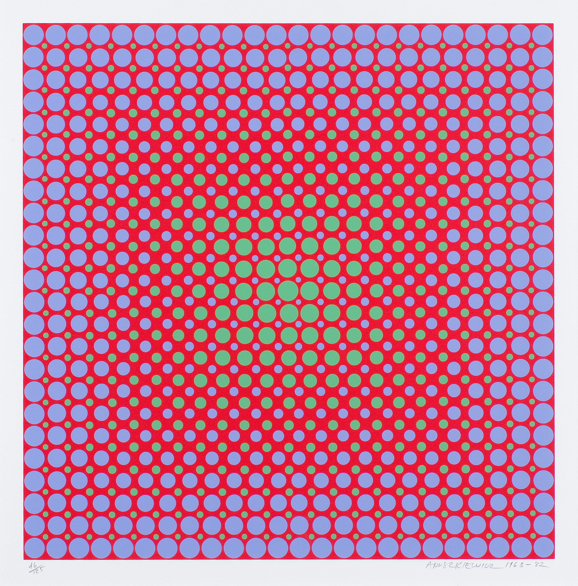 Richard Anuszkiewicz (ur. 23 V 1930 Erie w stanie Pensylwania, USA) - amerykański malarz, grafik i rzeźbiarz. Studiował w Cleveland Institute of Art (1948-1953), następnie ukończył Yale University School of Art and Architecture (1953-1955) pod kierunkiem Josepha Albersa. Pod jego wpływem porzucił malarstwo figuratywne na rzecz abstrakcji geometrycznej i efektów kolorystycznych. W 1957 przeniósł się do Nowego Jorku, gdzie pracował jako konserwator w Metropolitan Museum i projektant wyrobów ze srebra dla firmy jubilerskiej Tiffany. Tworzył obrazy bazujące na zwielokrotnionych, głównie geometrycznych formach i liniach, które wywoływały optyczne złudzenia ruchu i przenikania się kształtów. Szybko stał się jednym z czołowych reprezentantów op-artu jego specyficznie amerykańskiej odmiany, tzw. hard-edge painting. Od wczesnych lat 60. zajmuje się też grafiką (litografia, serigrafia, techniki metalowe), a w końcu tej dekady zaczął też tworzyć rzeźby w drewnie i formy przestrzenne. Wielokrotnie wystawiał w czołowych galeriach i muzeach Stanów Zjednoczonych, Australii i Europy (w Polsce – w Muzeum Sztuki w Łodzi w 1975/76). Jego prace znajdują się w licznych kolekcjach na całym świecie.
