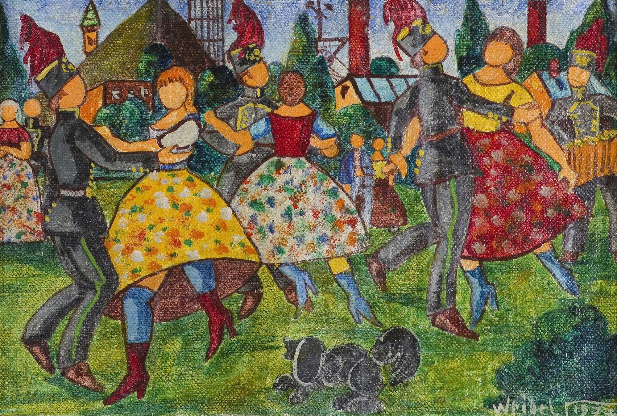Paweł Wróbel (1913 Katowice-Szopienice - Katowice 1984) - artysta nieprofesjonalny, górnik, jeden z najaktywniejszych członków koła plastyków amatorów przy ZDK kopalni "Wieczorek". W swojej twórczości skupiał się na przedstawieniu obrazów ginącego Śląska z charakterystycznymi kominami, hałdami, szybami kopalnianymi. Jego żywiołowe i niezwykle barwne scenki rodzajowe ukazują dzień powszedni i świąteczny mieszkańców górniczych osiedli. Twórczość Wróbla charakteryzuje bogata kolorystyka, uproszczone geometryczne formy przedstawionych budynków, postacie z ledwo zaznaczonymi twarzami oraz bogactwo szczegółów. Artysta poza malarstwem uprawiał rzeźbę, jednak prac w drewnie i węglu pozostawił niewiele. Zyskał przydomek śląskiego Brueghla.