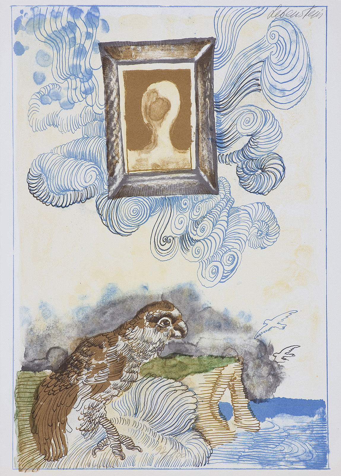 Jan Lebenstein (Brześć Litewski 1930 - Kraków 1999) w latach 1948-1954 studiował malarstwo w ASP w Warszawie pod kierunkiem prof. Eugeniusza Eibischa i Artura Nachta-Samborskiego. W 1955 wziął udział w wystawie w warszawskim Arsenale. Zaprzyjaźniony w czasie studiów z Mironem Białoszewskim, swą pierwszą wystawę indywidualną pokazał w 1956 w Teatrze na Tarczyńskiej. W 1959 zdobył Grand Prix de la Ville de Paris na I Biennale Młodych w Paryżu i w tym roku przeniósł się na stałe do Paryża. Po seriach "figur kreślonych" (na papierze milimetrowym) i "figur hieratycznych" z lat 1955-1958 maluje cykl "figur osiowych" (1958-1962), które wystawia w Paryżu i USA. Równolegle w 1960 zaczyna rysowane "karnety", rodzaj dziennika, który w przyszłości dostarczy motywów wykorzystanych w obrazach. W latach 1964-1965 maluje "Bestiarium", cykl fakturowych, archaizowanych stworów przypominających prehistoryczne wykopaliska. Bezpośrednio po nich wprowadza do swych obrazów postaci ludzkie i fantastyczne, odgrywające sceny ni to mitologiczne, ni to ze snu, często przesycone erotyką. W 1970 projektuje witraże dla Centre du Dialogue w Paryżu. W W 1971 otrzymuje obywatelstwo francuskie 1974 powstają gwasze inspirowane Folwarkiem zwierzęcym George'a Orwella. W latach 1976-1989 tworzy wyłącznie w technice gwaszu i pastelu, podejmując tematykę mitologiczną i zaczerpniętą z Biblii: cykle ilustracji do Księgi Hioba (wyd. 1979) i do Apokalipsy (wyd. 1986) w nowych przekładach Czesława Miłosza. W 1989 powraca do malarstwa olejnego (cykl "Pergamon"). Artysta otrzymał m. in. nagrodę Fundacji im. Alfreda Jurzykowskiego w 1976, Nagrodę Muzeum Archidiecezji Warszawskiej w 1985, Nagrodę im. Jana Cybisa w 1987.