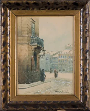 Władysław Chmieliński (Warszawa 1911 - Warszawa 1979) był malarzem związanym z Warszawą, gdzie stale mieszkał i pracował. W latach 1926-1931 studiował w warszawskiej Miejskiej Szkole Sztuk Zdobniczych i Malarstwa (dawna Klasa Rysunkowa). Wiodącym tematem jego obrazów były widoki miejskie, malowane olejno i akwarelą. W latach 1935-1938 stworzył cykl akwarel przedstawiających obiekty polskiej architektury; wśród nich, widoki Sandomierza, Krakowa, Kazimierza nad Wisłą, a także wnętrza zabytkowych kościołów czy pałaców, m.in. Zamku Królewskiego w Warszawie i Pałacu w Wilanowie. Malował także pejzaże i wiejskie sceny rodzajowe – kuligi, sanny, zaprzęgi, wesela, konie na tle krajobrazu. W latach 1967-1969 wyjeżdżał na dłuższe pobyty do Danii. W latach 1936-1939 artysta używał także pseudonimu „Władysław Stachowicz”.