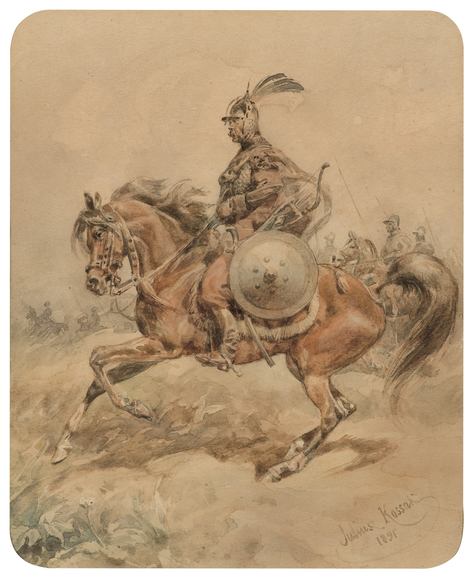 Juliusz Kossak (Wiśnicz 1824 - Kraków 1899) - malarz i ilustrator - był jednym z najpopularniejszych artystów polskich 2. połowy XIX wieku. Naukę rysunku i malarstwa rozpoczął we lwowskiej pracowni Jana Maszkowskiego; później wiele rysował z natury odwiedzając majątki szlacheckie na Ukrainie, Podolu i Wołyniu. W roku 1852 był w Wiedniu, na Węgrzech i w Petersburgu, a następnie zamieszkał na stałe w Warszawie. Lata 1856-1860 spędził w Paryżu, gdzie przyjaźnił się z Horacem Vernetem. Powróciwszy do Warszawy w latach 1862-1868 był kierownikiem artystycznym „Tygodnika Ilustrowanego”. W roku 1869 przeniósł się na stałe do Krakowa, skąd wyjeżdżał jeszcze do Monachium, by malować w atelier batalisty Franza Adama. Kossak był przede wszystkim znakomitym akwarelistą; rzadziej posługiwał się techniką olejną. Malował obrazy historyczne i batalistyczne, sceny rodzajowe ilustrujące życie i tradycje dworu szlacheckiego oraz obyczaje polskiego ludu. Ale prawdziwymi bohaterami jego obrazów były konie, których ruch, temperament, charakter i indywidualność potrafił po mistrzowsku przedstawić. Był także autorem wielu ilustracji do czasopism i książek, trafiającym bezbłędnie tak w klimat utworów literackich, jak i w tęsknoty i potrzeby odbiorców - czytelników Pieśni o ziemi naszej Wincentego Pola, Trylogii Henryka Sienkiewicza, Pana Tadeusza i poematów Adama Mickiewicza.