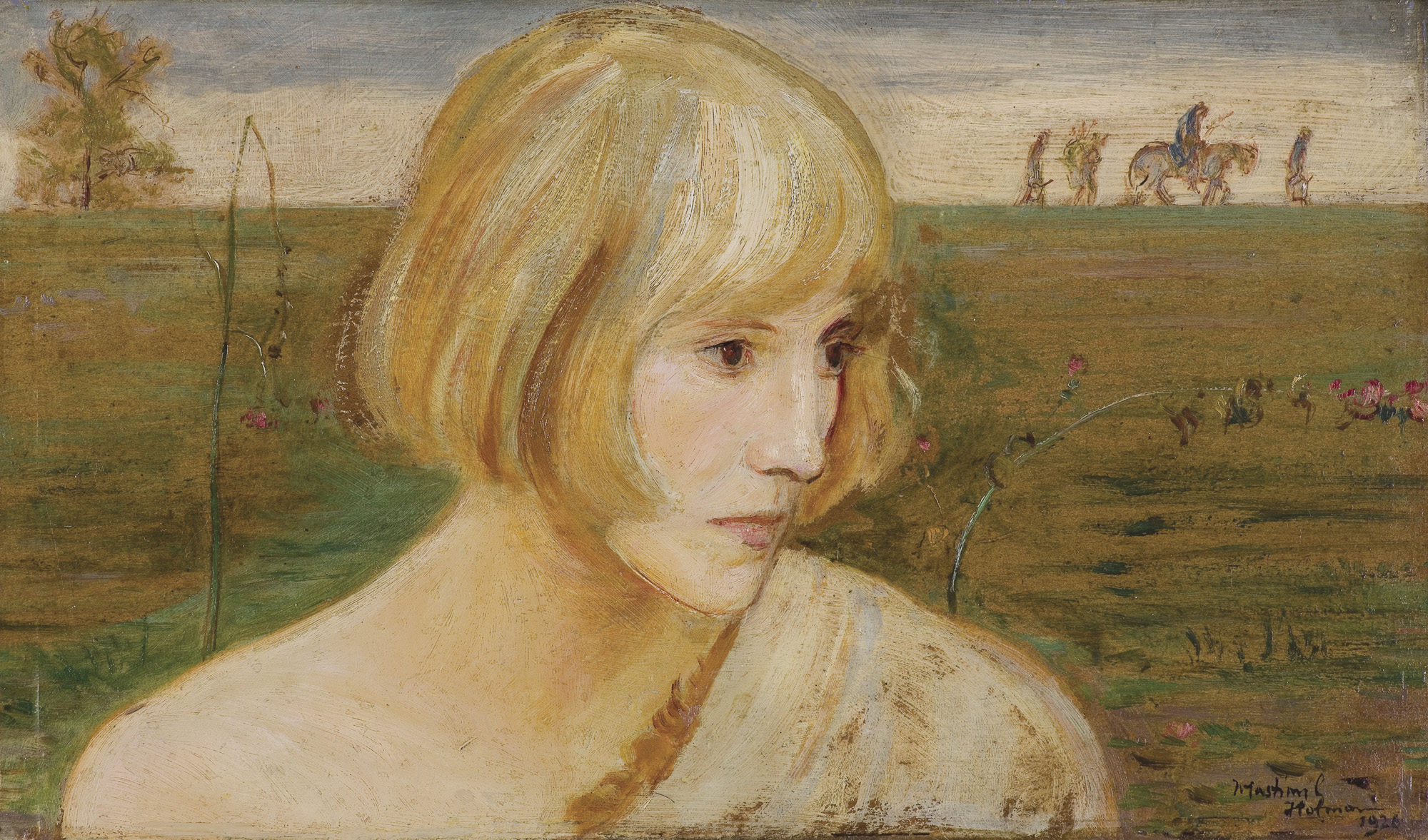 Wlastimil Hofman / Vlastimil Hofmann (Praga 1881 - Szklarska Poręba 1970) studiował w krakowskiej Szkole Sztuk Pięknych - początkowo pod kierunkiem Floriana Cynka, później także u Jana Stanisławskiego, Leona Wyczółkowskiego i Jacka Malczewskiego. W latach 1899-1902 uczył się jeszcze u Jeana Léona Gérôme’a w paryskiej École des Beaux-Arts. W czasie I wojny światowej przebywał w Pradze i w Paryżu; od 1920 stale mieszkał w Krakowie. Dużo wystawiał; należał do wielu stowarzyszeń twórczych - był współzałożycielem „Grupy Pięciu” (1905) i „Grupy Zero” (1908), członkiem Związku Artystów Czeskich „Manes”, a od 1911 członkiem Tow. Artystów Polskich „Sztuka”. W czasie II wojny światowej poprzez ZSRR i Turcję przedostał się do Jerozolimy, skąd w roku 1946 wrócił do Krakowa. Od roku 1947 stale mieszkał w Szklarskiej Porębie. Hofman malował przede wszystkim fantastyczno-symboliczne kompozycje o motywach ludowych oraz sceny rodzajowe, portrety i pejzaże. Jego obrazy mimo bliskich analogii i powiązań ze sztuką Malczewskiego odznaczają się zawsze indywidualnym charakterem, stylem i nastrojem.