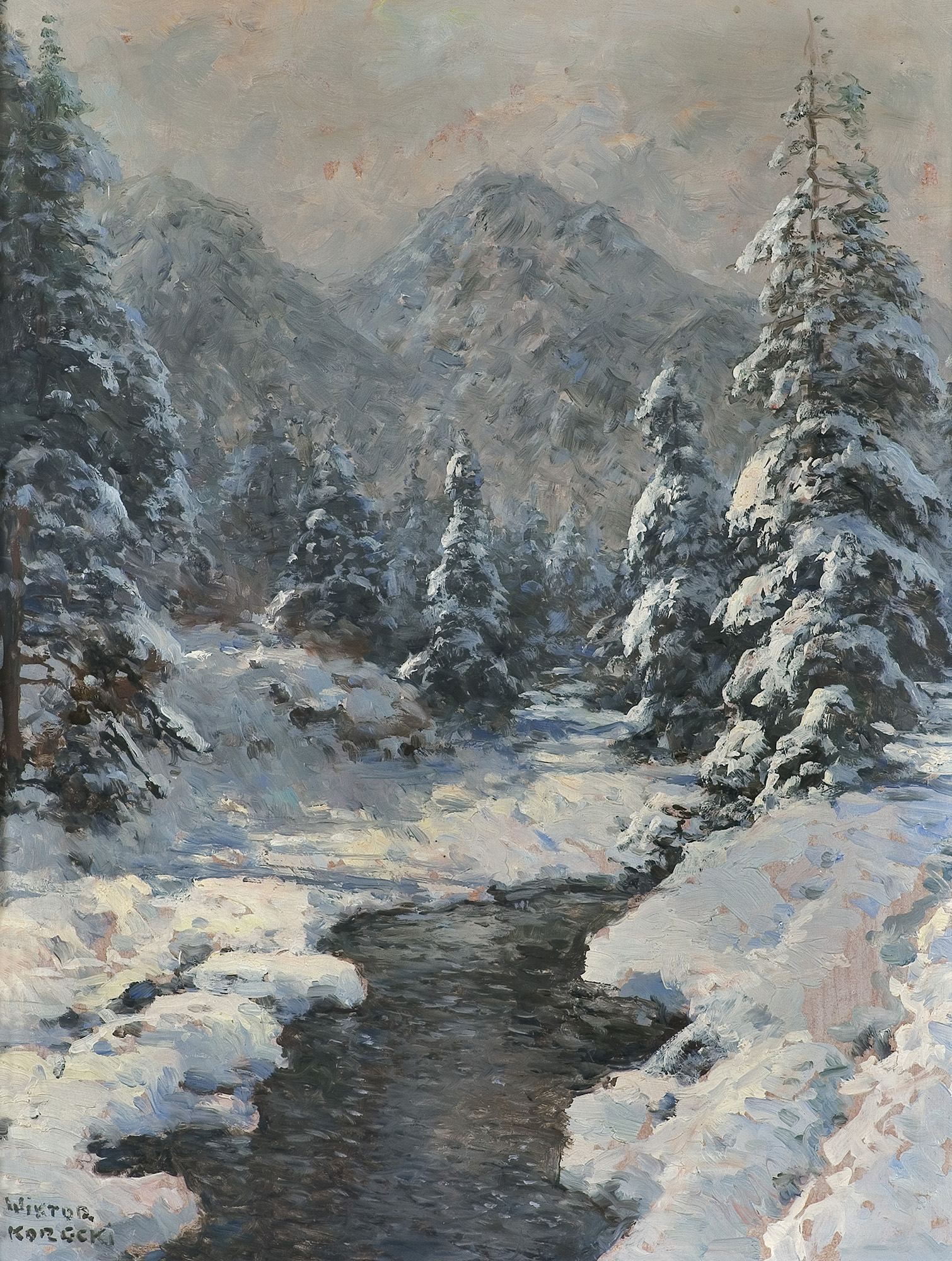 Wiktor Korecki (Kamieniec Podolski 1890 - Komorów k. Warszawy 1980) - malarz pejzażysta - gimnazjum ukończył w Kijowie, tam też studiował w Szkole Rysunkowej Aleksandra Muraszki. Po studiach wrócił do Kamieńca Podolskiego, skąd w roku 1921 wyjechał do Warszawy. Tu miał pracownię na rogu ulic Tamki i Cichej. Niestety zgromadzone tam obrazy spłonęły w czasie powstania 1944 roku. Po powstaniu artysta przebywał w obozie w Pruszkowie skąd trafił do obozu pracy w Lipsku. Do kraju powrócił w roku 1946 i zamieszkał w Komorowie pod Warszawą, a później w Milanówku. Jego nastrojowe krajobrazy emanujące spokojem i pogodą cieszyły się zawsze dużą popularnością. Korecki najczęściej malował pejzaże zimowe z motywem leśnej drogi i strumienia wijącego się wśród śniegów, a obok nich także wiosenne, letnie czy jesienne widoki z Mazowsza.