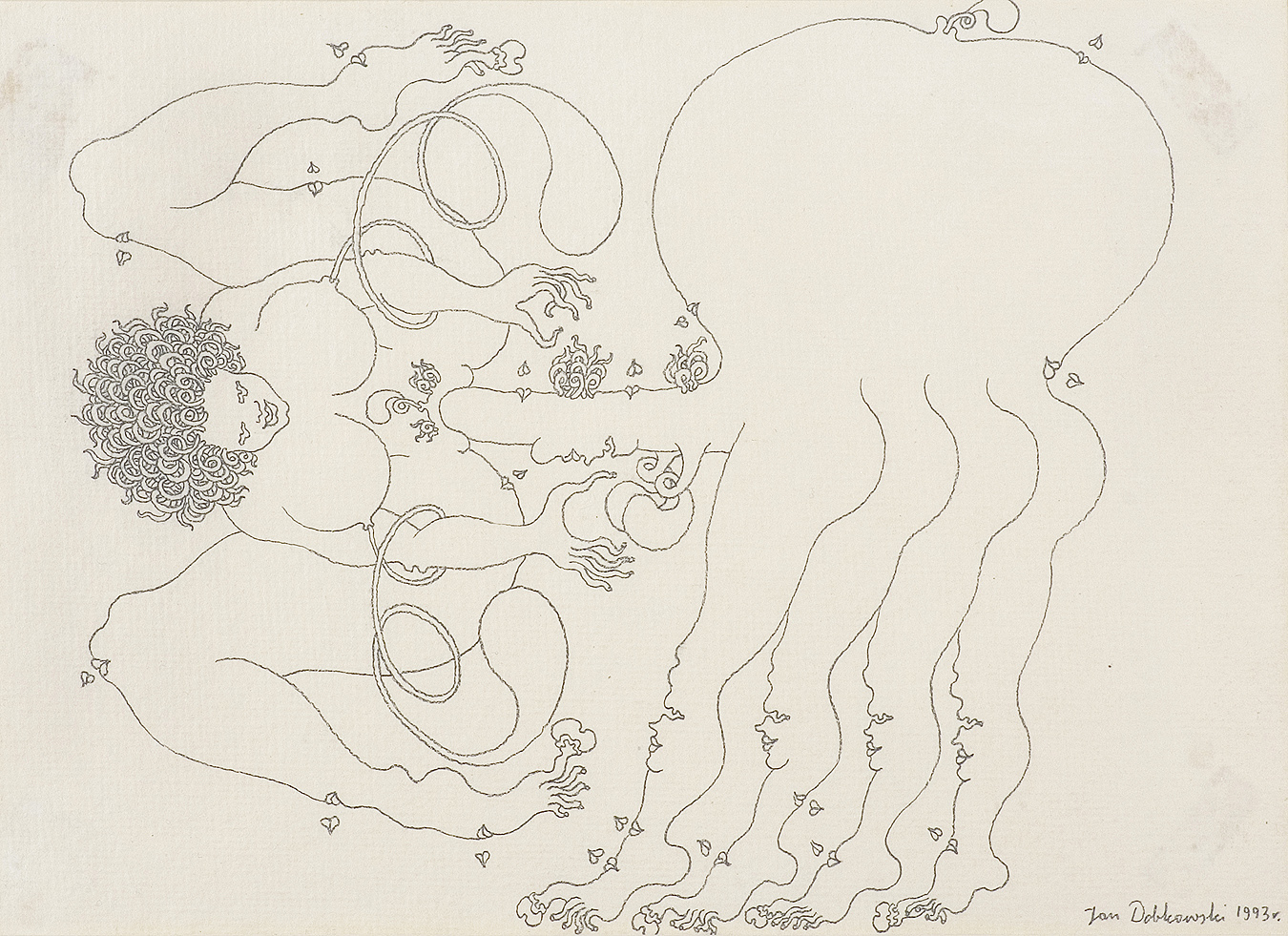 Jan Dobkowski (Łomża 1942, mieszka w Warszawie) studiował w latach 1962-1968 na Wydziale Malarstwa warszawskiej ASP pod kierunkiem prof. Juliusza Studnickiego i Jana Cybisa. Będąc jeszcze na studiach, w 1966, utworzył duet artystyczny, w którym jego partnerem był Jerzy (Jurry) Zieliński. Ich pierwsza wspólna wystawa pn. Neo-Neo-Neo odbyła się w Warszawie w 1967. Wystawiali wspólnie do 1970. W 1968 powstały pierwsze zielono-czerwone obrazy Dobkowskiego (używającego w tym czasie pseudonimu Dobson). W pracach tych, operujących giętkimi, falistymi liniami, w których upatrywano wpływów secesji, artysta używał sposobów rodem z op-artu dla wywołania złudzeń optycznych (wirowanie, mżenie, pozorny ruch form). Równolegle z obrazami tworzył też formy z płyt i folii do montowania w przestrzeni. Złoty medal na Sympozjum Złotego Grona w Zielonej Górze w 1971 i blisko roczny pobyt w USA na stypendium Fundacji Kościuszkowskiej w 1972 to kolejne etapy pełnej sukcesów kariery malarza. Wyraźną zmianę nastroju i wymowy jego prac przyniosły wydarzenia 1980-1981 roku, zwłaszcza wprowadzenie stanu wojennego. Monochromatyczne, ciemne płótna znaczył wtedy nikłymi, wiotkimi liniami rysunku. Najczęstszym motywem były patriotyczne i religijne symbole, dopowiadane tytułami nawiązującymi do realiów czasu. Kolejna radykalna zmiana nastąpiła ok. 1990. Symbolicznym zwiastunem nowego okresu stał się olbrzymi, radosny, eksplodujący bogactwem barw, kształtów i ruchu obraz ...a życie sobie płynie... (394 x 588 cm) z 1990-1991. Podobne cechy formalne charakteryzują twórczość artysty w całej dekadzie lat 90. Równolegle z malarstwem Dobkowski pracuje nad rysunkiem, będącym bardzo ważnym dopełnieniem jego twórczości.