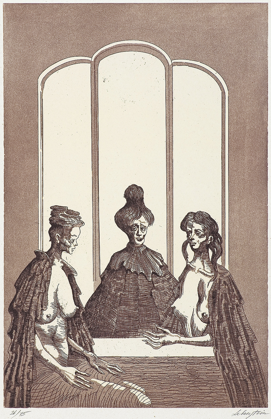 Jan Lebenstein (Brześć Litewski 1930 - Kraków 1999) w latach 1948-1954 studiował malarstwo w ASP w Warszawie pod kierunkiem prof. Eugeniusza Eibischa i Artura Nachta-Samborskiego. W 1955 wziął udział w wystawie w warszawskim Arsenale. Zaprzyjaźniony w czasie studiów z Mironem Białoszewskim, swą pierwszą wystawę indywidualną pokazał w 1956 w Teatrze na Tarczyńskiej. W 1959 zdobył Grand Prix de la Ville de Paris na I Biennale Młodych w Paryżu i w tym roku przeniósł się na stałe do Paryża. Po seriach "figur kreślonych" (na papierze milimetrowym) i "figur hieratycznych" z lat 1955-1958 maluje cykl "figur osiowych" (1958-1962), które wystawia w Paryżu i USA. Równolegle w 1960 zaczyna rysowane "karnety", rodzaj dziennika, który w przyszłości dostarczy motywów wykorzystanych w obrazach. W latach 1964-1965 maluje "Bestiarium", cykl fakturowych, archaizowanych stworów przypominających prehistoryczne wykopaliska. Bezpośrednio po nich wprowadza do swych obrazów postaci ludzkie i fantastyczne, odgrywające sceny ni to mitologiczne, ni to ze snu, często przesycone erotyką. W 1970 projektuje witraże dla Centre du Dialogue w Paryżu. W W 1971 otrzymuje obywatelstwo francuskie 1974 powstają gwasze inspirowane Folwarkiem zwierzęcym George'a Orwella. W latach 1976-1989 tworzy wyłącznie w technice gwaszu i pastelu, podejmując tematykę mitologiczną i zaczerpniętą z Biblii: cykle ilustracji do Księgi Hioba (wyd. 1979) i do Apokalipsy (wyd. 1986) w nowych przekładach Czesława Miłosza. W 1989 powraca do malarstwa olejnego (cykl "Pergamon"). Artysta otrzymał m. in. nagrodę Fundacji im. Alfreda Jurzykowskiego w 1976, Nagrodę Muzeum Archidiecezji Warszawskiej w 1985, Nagrodę im. Jana Cybisa w 1987.