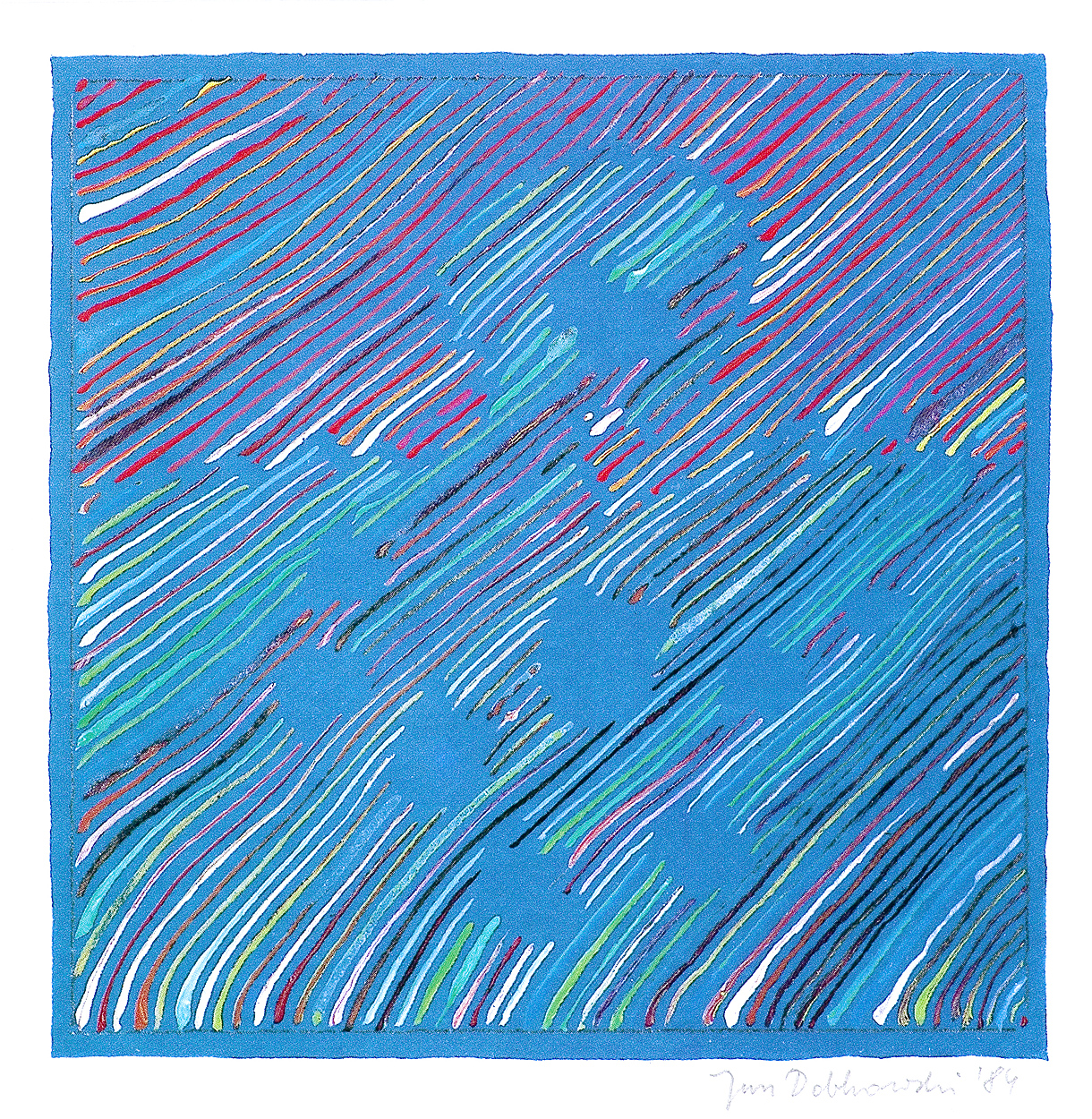 Jan Dobkowski (Łomża 1942, mieszka w Warszawie) studiował w latach 1962-1968 na Wydziale Malarstwa warszawskiej ASP pod kierunkiem prof. Juliusza Studnickiego i Jana Cybisa. Będąc jeszcze na studiach, w 1966, utworzył duet artystyczny, w którym jego partnerem był Jerzy (Jurry) Zieliński. Ich pierwsza wspólna wystawa pn. Neo-Neo-Neo odbyła się w Warszawie w 1967. Wystawiali wspólnie do 1970. W 1968 powstały pierwsze zielono-czerwone obrazy Dobkowskiego (używającego w tym czasie pseudonimu Dobson). W pracach tych, operujących giętkimi, falistymi liniami, w których upatrywano wpływów secesji, artysta używał sposobów rodem z op-artu dla wywołania złudzeń optycznych (wirowanie, mżenie, pozorny ruch form). Równolegle z obrazami tworzył też formy z płyt i folii do montowania w przestrzeni. Złoty medal na Sympozjum Złotego Grona w Zielonej Górze w 1971 i blisko roczny pobyt w USA na stypendium Fundacji Kościuszkowskiej w 1972 to kolejne etapy pełnej sukcesów kariery malarza. Wyraźną zmianę nastroju i wymowy jego prac przyniosły wydarzenia 1980-1981 roku, zwłaszcza wprowadzenie stanu wojennego. Monochromatyczne, ciemne płótna znaczył wtedy nikłymi, wiotkimi liniami rysunku. Najczęstszym motywem były patriotyczne i religijne symbole, dopowiadane tytułami nawiązującymi do realiów czasu. Kolejna radykalna zmiana nastąpiła ok. 1990. Symbolicznym zwiastunem nowego okresu stał się olbrzymi, radosny, eksplodujący bogactwem barw, kształtów i ruchu obraz ...a życie sobie płynie... (394 x 588 cm) z 1990-1991. Podobne cechy formalne charakteryzują twórczość artysty w całej dekadzie lat 90. Równolegle z malarstwem Dobkowski pracuje nad rysunkiem, będącym bardzo ważnym dopełnieniem jego twórczości.