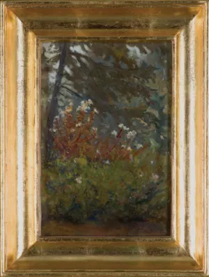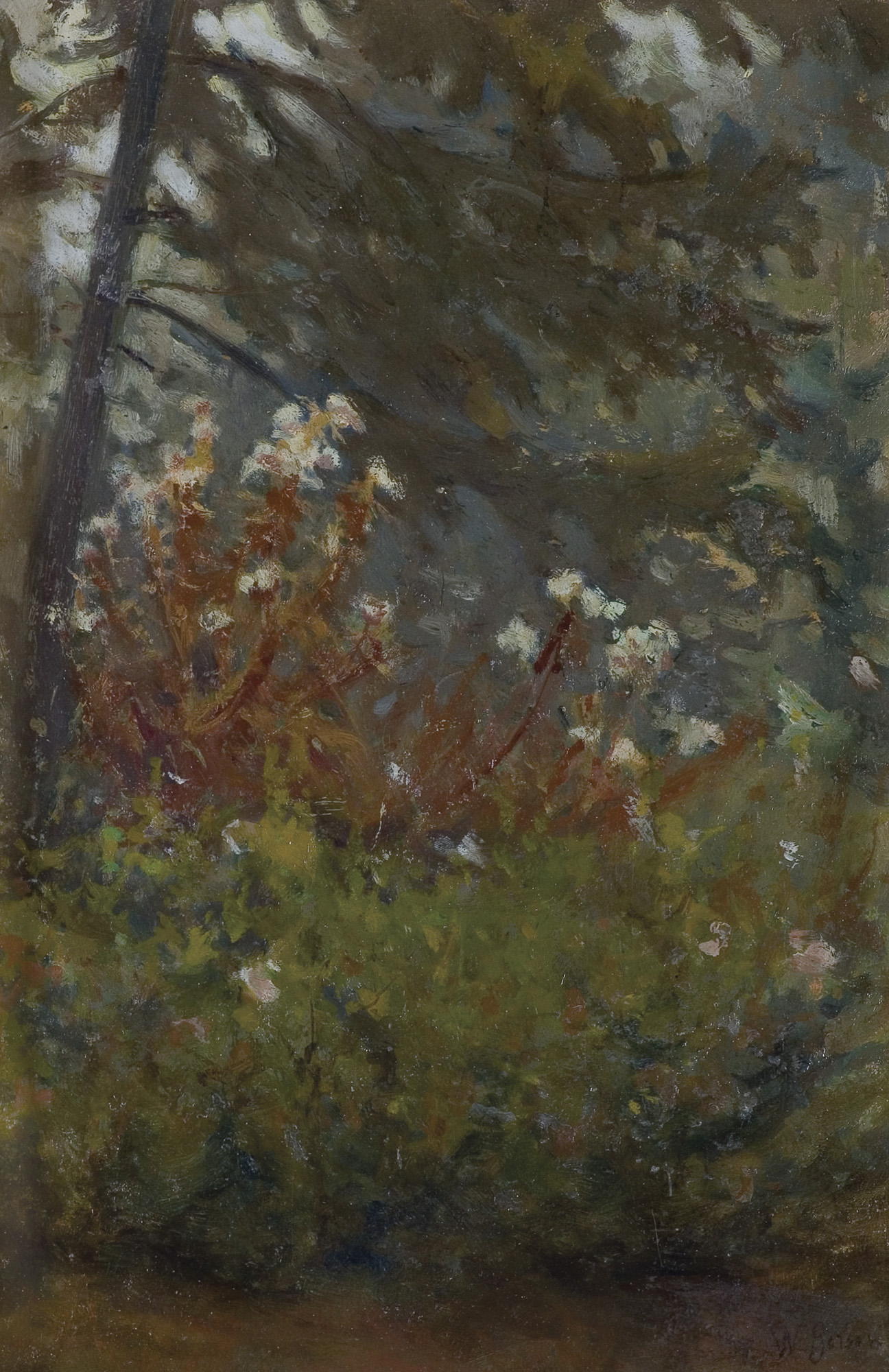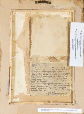 Na odwr. nieczytelny napis ołówkiem; obok numer (ołówkiem): 43 II; poniżej naklejona kartka z odręczną opinią dr. Kazimierza Buczkowskiego z lipca 1944 roku potwierdzającą autentyczność obrazu Wojciecha Gersona; ponadto na prawej listwie ramy dwujęzyczna nalepka (po polsku i po angielsku) zawierająca krótki opis obrazu; na dolnej listwie ramy nalepka inwentarzowa Muzeum Okręgowego w Rzeszowie (druk): Wojciech Gerson, Pejzaż leśny, olej, tektura, kolekcja prywatna, nr inw. | Dep. MRA 2050