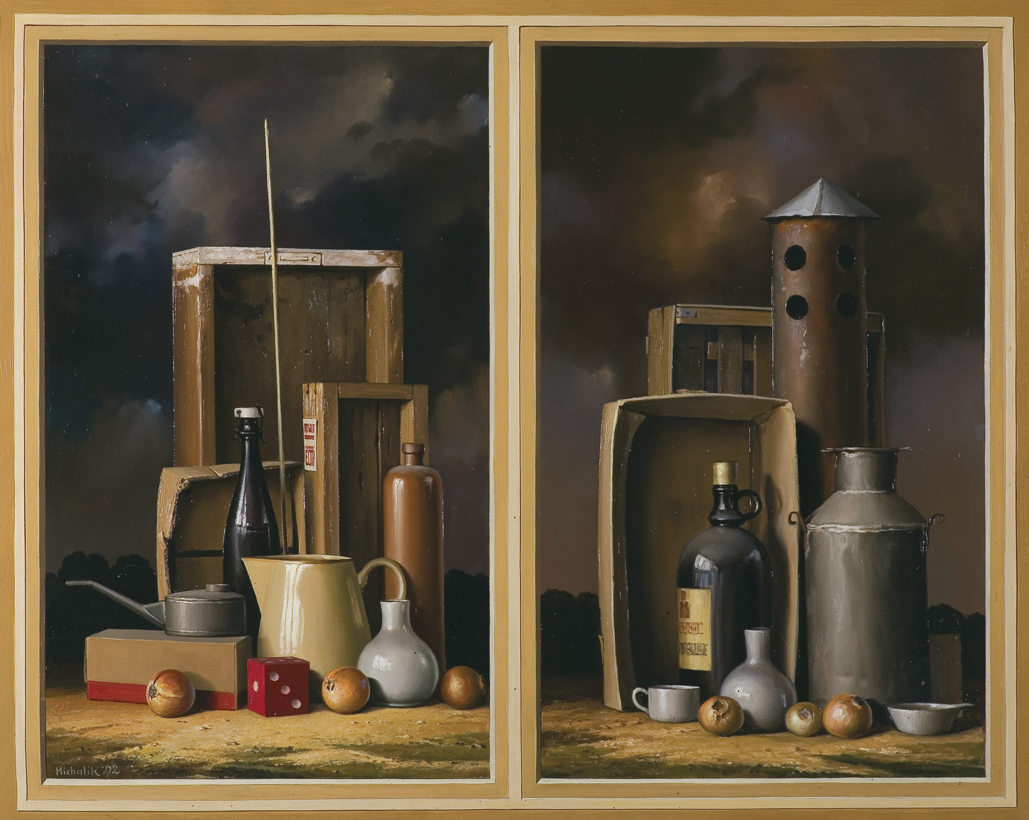 Marian Michalik (Zabrze 1947 - Częstochowa 1997) - był absolwentem Liceum Sztuk Plastycznych w Częstochowie. Po jego ukończeniu w 1966 zajmował się grafiką użytkową. Kilka lat później zwrócił się ku malarstwu, w którym doskonalił się samodzielnie. W 1979 został przyjęty do Związku Polskich Artystów Plastyków. Od tego czasu intensywnie wystawiał w kraju i za granicą, uzyskując wiele nagród na krajowych i miedzynarodowych konkursach, m.in. złoty medal na „Bielskiej Jesieni“ w 1980, wyróżnienie na XV Grand Prix d'Art Contemporain, Monte Carlo 1981, nagroda na Międzynarodowym Biennale Malarstwa, Koszyce 1985. W 1987 został członkiem Europejskiej Akademii Sztuki, Nauki I Literatury w Paryżu. Tworzył w konwencji magicznego realizmu, precyzyjnie odtwarzając banalne przedmioty codziennego użytku, różne narzędzia, płody natury itp., a następnie tworząc ich niezwykłe zestawienia. Stosując ciemną kolorystykę i efekty świetlne nawiązywał do historycznego malarstwa mistrzów holenderskich martwych natur.