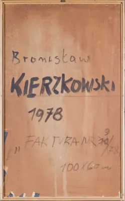 Bronisław Kierzkowski (Łódź 28 VIII 1924 – Warszawa 21 V 1993) studiował w latach 1946-1947 w Państwowej Wyższej Szkole Sztuk Plastycznych w Łodzi pod kierunkiem Władysława Strzemińskiego. Kontynuował studia w uczelni tego samego typu w Gdańsku pod kierunkiem Juliusza Studnickiego (1948-1950), a następnie w Akademii Sztuk Pięknych w Warszawie pod kierunkiem Eugeniusza Eibischa (1951-1955). Dyplom tej uczelni uzyskał w 1956. Uczył w niej w latach 1962-1963, a następnie na Wydziale Sztuk Pięknych Uniwersytetu Mikołaja Kopernika w Toruniu oraz na UMCS w Lublinie (1963-1978). Od 1978 zatrudniony ponownie na Wydziale Malarstwa ASP w Warszawie, prowadził tam pracownię rysunku. W 1987 otrzymał tytuł profesora, w 1988 przeszedł na emeryturę. W pierwszym okresie twórczości malował syntetyczne pejzaże, tworzył też kolaże, w których najwcześniej przekroczył granicę abstrakcji. Po eksperymentach z malarstwem informel i malarstwem materii, od ok. 1957 tworzył najbardziej dlań charakterystyczne reliefy w gipsie. Stosował metodę zatapiania w stygnącej masie gipsowej elementów metalowych – przedmiotów gotowych, części mechanizmów, odpadów, jak strużyny czy ścinki blach, siatki, druty itp. Formował w ten sposób assemblages o zaskakująco – jak na „śmietnikowe” pochodzenie elementów składowych – szlachetnym wyrazie. W latach 60. artysta rozszerzył swe zainteresowania na formy monumentalne i przestrzenne, niekiedy ruchome, prezentując prace tego typu podczas I Biennale Form Przestrzennych w Elblągu (1965), I Sympozjum Artystów i Naukowców w Puławach (1966), III Sympozjum Złotego Grona w Zielonej Górze (1967). Na ostatniej z tych imprez zaprezentował environment. W późniejszych latach wrócił do rozwiązań fakturowych na płaszczyźnie, które rozwijał w cyklu „Fakturowce”. W latach 60. był związany z Galerią Krzywe Koło w Warszawie, w której wielokrotnie wystawiał. Brał też udział w ważnych wystawach zbiorowych, jak III Wystawa Sztuki Nowoczesnej, Warszawa 1959; I Biennale Młodych, Paryż 1959; "The Art of Assamblage" i "Painting and Sculpture", Museum of Modern Art, Nowy Jork 1961. w 1988 przeszedł na emeryturę. W pierwszym okresie twórczości malował syntetyczne pejzaże, tworzył też kolaże, w których najwcześniej przekroczył granicę abstrakcji. Po eksperymentach z malarstwem informel i malarstwem materii, od ok. 1957 tworzył najbardziej dlań charakterystyczne reliefy w gipsie.