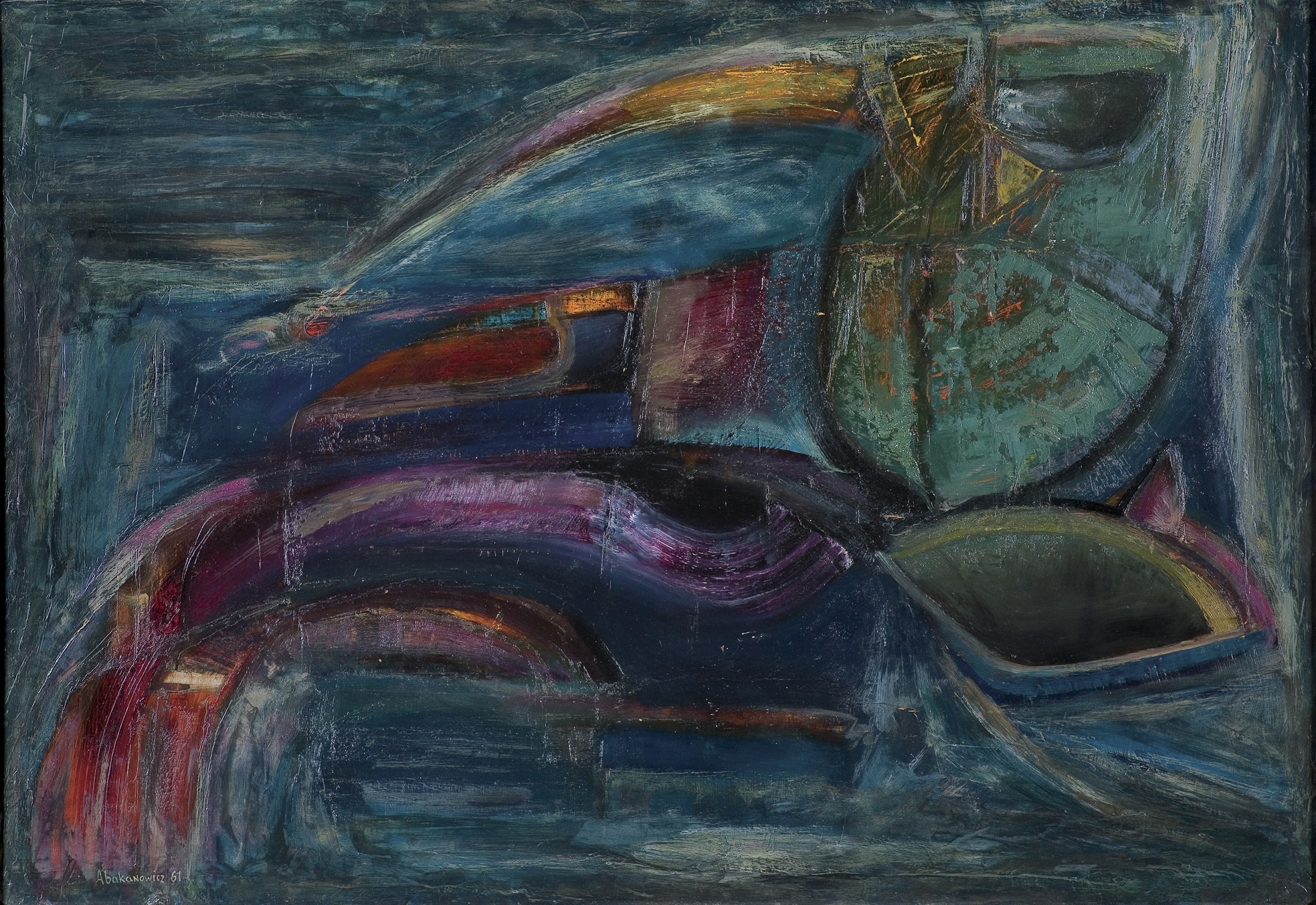 Magdalena Abakanowicz (Falenty k. Warszawy 20 VI 1930 - Warszawa 20. IV 2017) studiowała w Gdańsku (1949-1950) i w warszawskiej ASP (1950-1954). Wykładała w PWSSP w Poznaniu (1965-1990). Od pocz. lat 60. zajmowała się tkaniną unikatową, tworząc autorskie formy przestrzenne, nazwane od jej nazwiska „abakanami“. W 1965 zdobyła Złoty Medal na II Międzynarodowym Biennale Tkaniny w Sao Paulo. W latach 70. zaczęła tworzyć cykle figuralne z juty utwardzanej żywicą: „Alteracje“ (od 1974), „Plecy“ (1976-80), „Embriologia“ (1978-80), "Tłumy" (od 1986). Od lat 80. artystka uprawia rzeźbę plenerową, używając drewna, gliny, kamienia i odlewów (grupy „Tłum“, „Katharsis“ w prywatnej kolekcji we Włoszech, „Negev“ - 7 kolosalnych kamiennych kół w parku Israel Museum w Jerozolimie). W 1987 zaczęła pracę nad „Grami wojennymi“, wielkimi formami przypominającymi pociski, konstruowanymi z naturalnego drewna i żelaza. Od 1991 rozwija koncepcję „architektury arborealnej“, pierwotnie projektowanej jako przedłużenie osi La Defense w Paryżu, którą propaguje jako rozwiązanie problemów wielkich aglomeracji. Uczestniczyła w najważniejszych przeglądach sztuki współczesnej, jak Biennale w Sao Paulo (1965, 1979), Biennale w Wenecji (1968, 1980) i in. Jest laureatką wielu polskich i zagranicznych nagród.