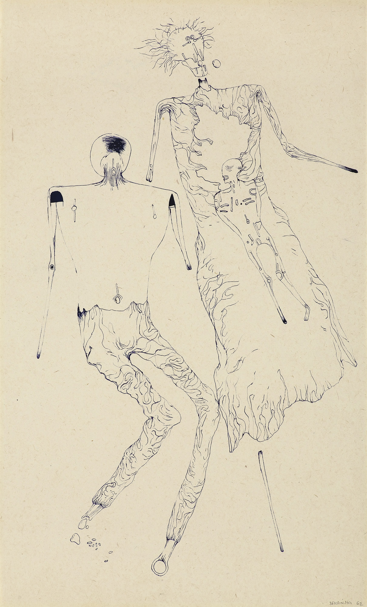 Zdzisław Beksiński (Sanok 24 II 1929 - Warszawa 21 II 2005) studiował w latach 1947-1952 na Wydziale Architektury Politechniki Krakowskiej. Był artystą samoukiem, który osiągnął niekwestionowaną pozycję w polskiej sztuce współczesnej, potwierdzoną obecnością jego prac na prestiżowych wystawach i w kolekcjach muzealnych. Początkowo zajmował się fotografią, którą interesował się od lat studenckich, po 1956 zyskując uznanie jako twórca fotogramów o estetyce opartej o efekty fakturowe. W latach 1958-1962 tworzył abstrakcyjne obrazy-reliefy o bogatej fakturze, głównie metalowe, będące odmianą malarstwa materii. Pod koniec tego okresu powstawały ażurowe formy o kształtach figur i pełnoplastyczne rzeźby w metalu. Kolejnym etapem jego twórczości były lata 1962-1974, kiedy poświęcał się głównie rysunkowi. W latach 60. rysował piórkiem i tuszem figuralne kompozycje odznaczające się karykaturalną deformacją postaci. Od końca lat 60. tworzył rysunki węglem i kredkami, będące monochromatyczną odmianą jego równoległej twórczości malarskiej. Od 1974 zajmował się niemal niepodzielnie malarstwem. Jego charakterystyczny styl bazował na perfekcji technicznej, której towarzyszyła niezwykłość wizji. Malował świat po katastrofie, naznaczony piętnem śmierci i rozpadu. Jego obrazy zaludniają postaci i stwory o ludzkich wprawdzie bądź zwierzęcych kształtach, lecz o cechach fantomów, automatów lub rozpadających się trucheł. Artysta nie nadawał swym obrazom i rysunkom tytułów (poza porządkującymi symbolami), akcentując w ten sposób swój brak zainteresowania dla literackiej strony przedstawień. Sam mówił, że malując całkowicie poddaje się wizji, „fotografuje“ ją. W ostatnich latach włączył do swego warsztatu artystycznego elektroniczne techniki generowania obrazu, które wykorzystywał do tworzenia komputerowych fotomontaży. Sztuka Beksińskiego, wielokrotnie wystawiana i omawiana, budzi skrajne emocje wśród znawców i publiczności.