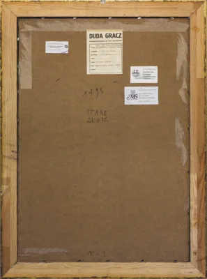 – śr.g.: nalepka autorska wypełniona odręcznie z danymi obrazu i sygnaturą;
