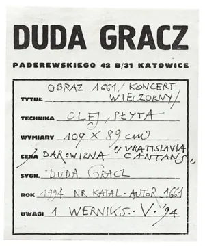 Przyjazne relacje między artystą a organizatorami festiwalu „Wratislavia Cantans“ trwały także w następnych latach, czego dowodem jest m.in. prezentowany obraz Obraz 1661 (Koncert wieczorny; Dla festiwalu „Wratislavia cantans“) z 1994 roku. Widoczna na obrazie postać zatroskanego, umęczonego życiem człowieka zdaje się znajdować ukojenie w muzyce obecnej w pejzażu, a uosobionej w postaci rusałki grającej na fujarce. Swoista muzyczność polskiego pejzażu w bardzo charakterystycznym ujęciu, typowym dla Dudy Gracza, z całą nostalgią i melancholią – rozwijająca się tutaj rytmicznie w diagonalnej kompozycji obrazu – powracać będzie jeszcze wielokrotnie w twórczości artysty, a najpełniejszy wyraz uzyska w późniejszym cyklu „chopinowskim“, który stanie się też jednym z punktów szczytowych w malarstwie Dudy Gracza.
