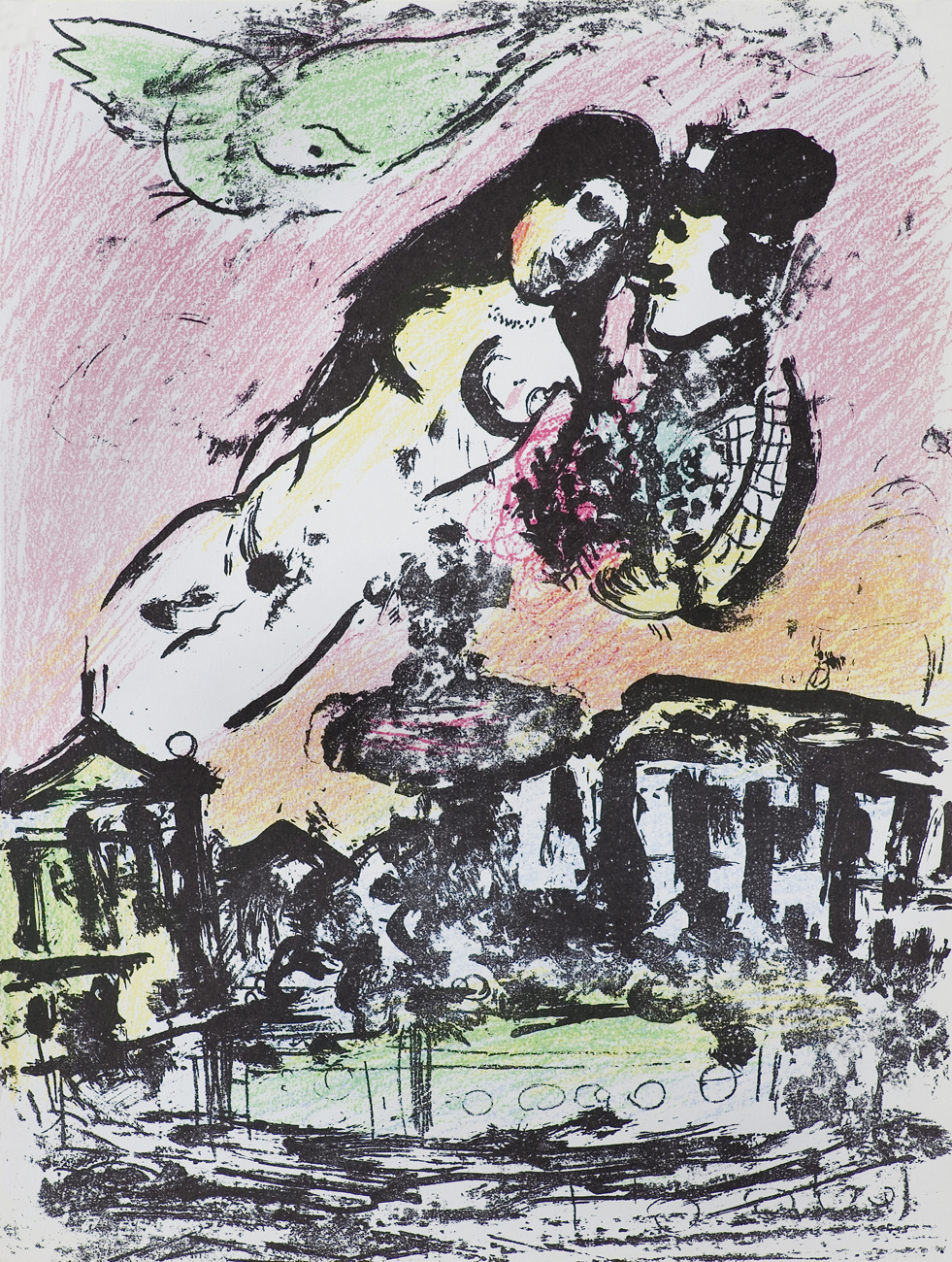 Marc Chagall uczył się rysunku u witebskiego malarza nazwiskiem Juda Pen, następnie od 1907 studiował w Akademii petersburskiej. W 1910 wyjechał na stypendium do Paryża. Zamieszkał w La Ruche na Montparnassie, wszedł do kręgu artystów, wśród których byli m.in. Modigliani, Soutine, Delaunay. W 1914 wrócił do Witebska, w 1915 poślubił Bellę (zm. 1944), muzę i bohaterkę wielu obrazów. W latach 1915-1917 mieszkał w Sankt Petersburgu, gdzie zastała go rewolucja. Mianowany komisarzem sztuk pięknych na obszar Witebska, założył tam i prowadził w latach 1918-1919 szkołę artystyczną, której profesorami byli m.in. Kazimierz Malewicz i El Lissitzky. W 1919 przeniósł się do Moskwy, gdzie do 1922 był kierownikiem artystycznym Państwowego Teatru Żydowskiego. W 1923 ostatecznie opuścił Rosję, osiedlając się w Paryżu. We Francji spędził resztę życia, z przerwą w latach 1941-1947, kiedy to schronił się w Nowym Jorku. Jego styl, wykształcony w młodości niezależnie od równoległych kierunków w sztuce, pozostał w ciągu życia artysty mało zmieniony. Wyobraźnia i sposób obrazowania Chagalla, zbliżone do sztuki naiwnej, wpisały się najsilniej w nurt surrealizmu, stając się jego znaczącym rozszerzeniem. Chagall łączył poetyckość i cudowność swych fantazji z rozwiniętym warsztatem malarza-kolorysty. Był też utalentowanym i płodnym grafikiem (cykle ilustracji do "Martwych dusz" Gogola, 1923-1927, "Bajek" La Fontaine’a, 1927-1930, Biblii, 1931-1955 – każdy cykl liczył ponad 100 plansz w technikach metalowych). Zajmował się scenografią (projekty dla Metropolitan Opera w Nowym Jorku, 1945, Opery w Paryżu, 1958), malarstwem monumentalnym (plafon w Operze paryskiej, 1963-1964), projektował witraże, dekoracje ceramiczne.
