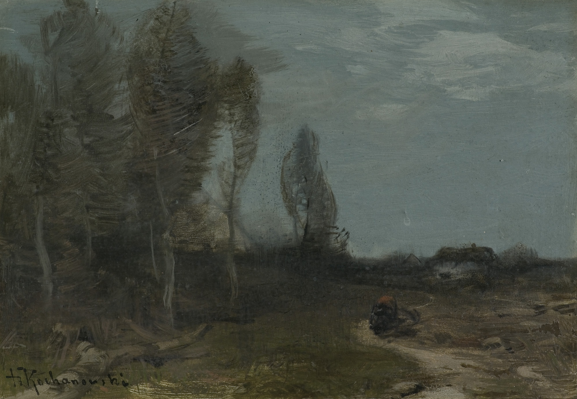 Roman Kochanowski (Kraków 1857 - Freising k. Monachium 1945) - malarz i grafik - był jednym z polskich artystów osiadłych i stałe działających w Monachium. Studia malarskie rozpoczął w Krakowie; początkowo w prywatnej pracowni Maksymiliana Cercha, a w latach 1873- 1875 w Szkole Sztuk Pięknych u Władysława Łuszczkiewicza i pejzażysty Henryka Grabińskiego. Przez następne dwa lata uczył się jeszcze na wydziale pejzażu w Akademii wiedeńskiej. W 1881 przeniósł się do Monachium, gdzie miał własną pracownię, a niebawem założył rodzinę. Często jednak przyjeżdżał do Krakowa, bywał w Poznańskiem, odbył podróż po Galicji i Podolu, rysując krajobrazy i widoki miast, które weszły następnie do albumu wydanego w Wiedniu w roku 1898. Artysta należał do monachijskiego Kunstvereinu, brał udział w wielu wystawach w Niemczech, w Wiedniu, w Londynie; swoje prace przesyłał też na pokazy krajowe. Malował przede wszystkim pejzaże a tylko z rzadka kwiaty i portrety. Stałym i ulubionym motywem jego obrazów był polski, podkrakowski krajobraz z wplecionymi weń postaciami ludzi. Obrazy artysty, malowane często na niewielkich deseczkach, pozbawione warstwy anegdotycznej odznaczają się niecodziennymi walorami malarskimi, harmonią koloru i pełnym liryzmu nastrojem. Zauważane i nagradzane na licznych wystawach były też wysoko cenione na rynku sztuki. W roku 1892, po wystawie w Wiedniu, jeden z obrazów Kochanowskiego zakupił do swoich zbiorów cesarz Franciszek Józef; dwa inne nabyli członkowie cesarskiej rodziny. Wielbicielem jego malarstwa był Karol Józef Luitpold, książę regent Bawarii. Wielka wrażliwość artysty na krajobraz i przyrodę widoczna jest także w jego rysunkach i akwafortach.