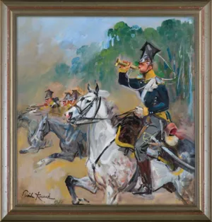 Wojciech Kossak (Paryż 1856 - Kraków 1942 ) – powszechnie znany malarz, postrzegany przede wszystkim jako świetny batalista. Syn i uczeń Juliusza Kossaka kształcił się w krakowskiej Szkole Sztuk Pięknych, w Akademii monachijskiej oraz w Paryżu. W latach 1895-1902 przebywał głównie w Berlinie, pracując dla cesarza Wilhelma II. Wiele podróżował, m.in. do Hiszpanii i Egiptu, gdzie wykonywał szkice do zamierzonych panoram. W późniejszych latach kilkakrotnie wyjeżdżał do Stanów Zjednoczonych wykonując zamówienia portretowe. W 1913 był mianowany profesorem warszawskiej Szkoły Sztuk Pięknych. W latach I wojny światowej pełnił służbę wojskową. Był współautorem panoram: „Racławice” (1893-1894), „Berezyna” (1895-1896), „Bitwa pod piramidami” (1901) oraz szkiców do niezrealizowanej „Somosierry” (1900). Z temperamentem i swobodą tworzył szeroko malowane, dynamiczne sceny batalistyczne, historyczne, rodzajowe oraz liczne portrety. Z upodobaniem malował konie. Jego obrazy, gloryfikujące dawne i współczesne artyście polskie wojsko i bohaterstwo żołnierzy, trafiały do patriotycznych uczuć odbiorców i cieszyły się ogromna popularnością.