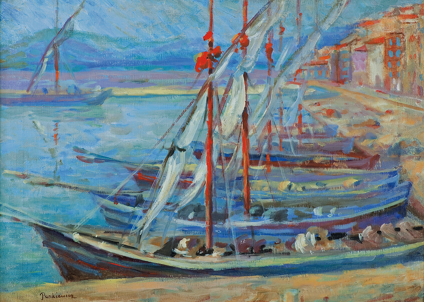 Oferowany obraz jest innym rozwiązaniem kompozycyjnym i kolorystycznym tego samego motywu z basenu portowego w Saint-Tropez, najbliższym dziełu Pankiewicza ze zbiorów prywatnych (repr. w katalogu wystawy, s. 60, nr I/133). Jak zawsze u Pankiewicza, interesujący jest tu sposób kształtowania przestrzeni. Artysta, pragnąc zwrócić uwagę na zwyczajny motyw łodzi zacumowanych w porcie, odwołał się do zasad klasycznej perspektywy, którą nieoczekiwanie zamknął w tle dwukrotnie, zbliżając podniesioną linię horyzontu i nieznacznie spłaszczając kompozycję. Wertykalnym akcentom masztów przeciwstawił poziomą linię falochronu. Dopiero za nią rozciąga się pas wody i zamykający zatokę zarys łagodnych wzgórz. Obraz powstał w plenerze i odznacza się cechami swobodnego studium z natury. Jest malowany pewnymi, długimi pociągnięciami niezbyt szerokiego pędzla, farbą rozprowadzaną zamaszyście lub krótkimi dotknięciami, jak i farbą kładzioną miejscami grubo. Dzieło wykazuje jednorodność materii malarskiej i charakterystyczne dla Pankiewicza cechy warsztatowe.