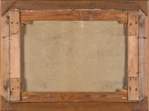 na górnej poprzeczce krosien po prawej stronie oznakowanie cyfrowe (zapewne dla ramiarza): 1977 | [...] | 57,5 x 40,5; na dolnej poprzeczce po prawej nr: 237914, po lewej ślad po prostokątnej nalepce.