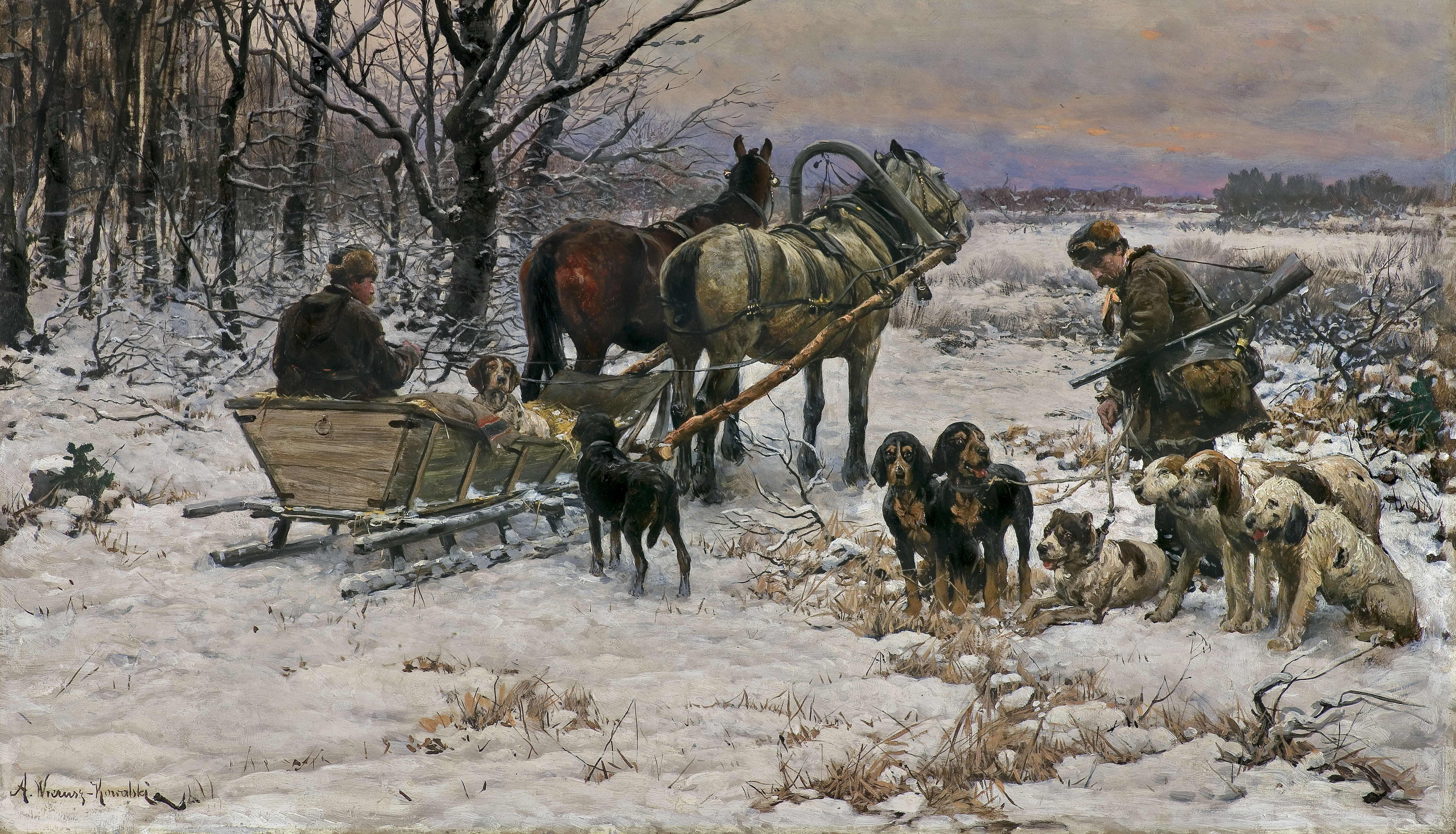 Wierusz-Kowalski, sam będąc zapalonym myśliwym, namalował wiele obrazów ze scenami odnoszącymi się do polowań. Zimowy pejzaż, w którym osadził scenę, daje artyście sposobność do śmiałych, a równocześnie efektownych rozwiązań luministyczno-kolorystycznych. Niebo rozświetla żółtoróżowa łuna wschodzącego słońca, od której barwę biorą śniegi pokrywające równinne pole. Wierusz w...