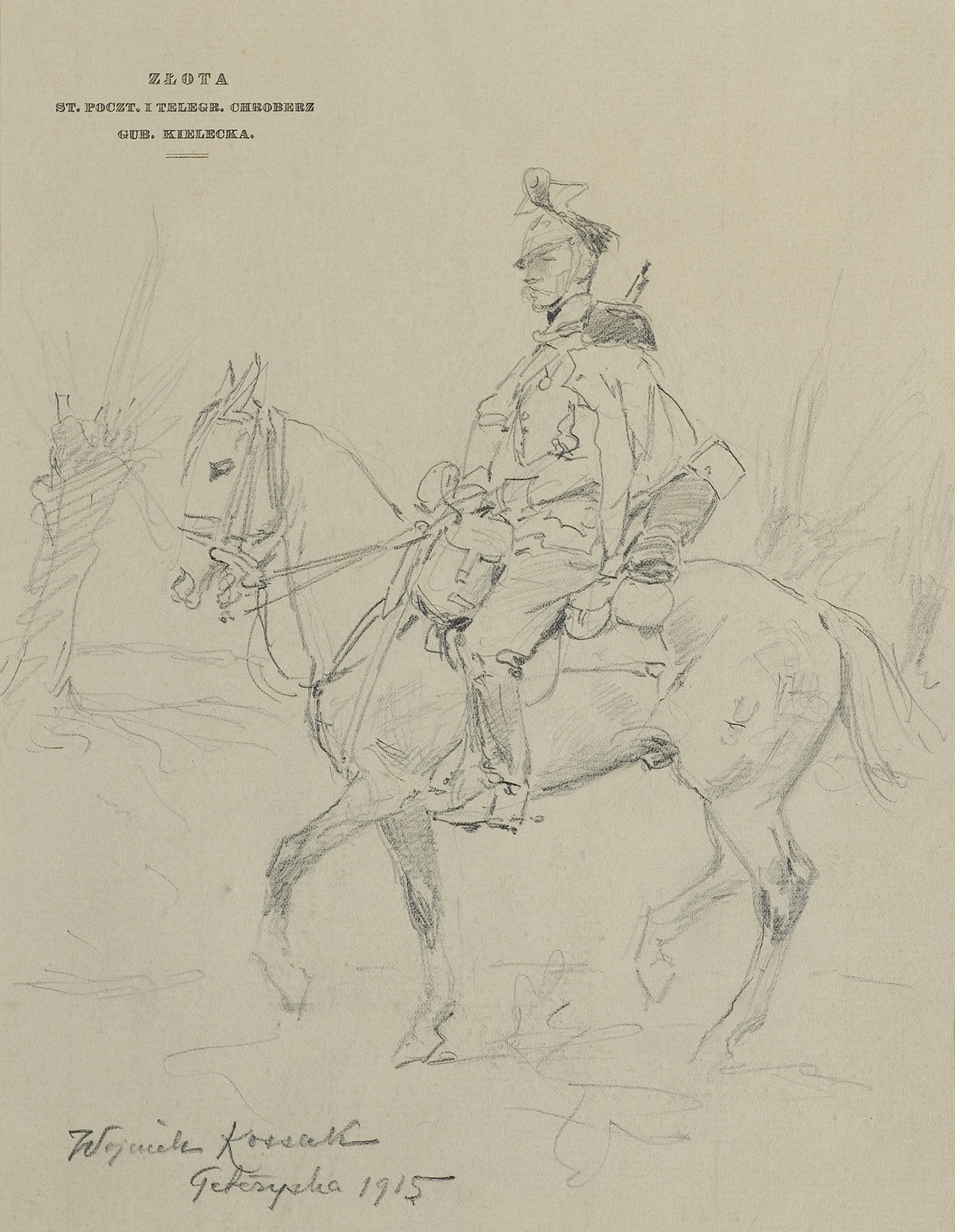 Wojciech Kossak (Paryż 1856 - Kraków 1942 ) – powszechnie znany malarz, postrzegany przede wszystkim jako świetny batalista. Syn i uczeń Juliusza Kossaka kształcił się w krakowskiej Szkole Sztuk Pięknych, w Akademii monachijskiej oraz w Paryżu. W latach 1895-1902 przebywał głównie w Berlinie, pracując dla cesarza Wilhelma II. Wiele podróżował, m.in. do Hiszpanii i Egiptu, gdzie wykonywał szkice do zamierzonych panoram. W późniejszych latach kilkakrotnie wyjeżdżał do Stanów Zjednoczonych wykonując zamówienia portretowe. W 1913 był mianowany profesorem warszawskiej Szkoły Sztuk Pięknych. W latach I wojny światowej pełnił służbę wojskową. Był współautorem panoram: „Racławice” (1893-1894), „Berezyna” (1895-1896), „Bitwa pod piramidami” (1901) oraz szkiców do niezrealizowanej „Somosierry” (1900). Z temperamentem i swobodą tworzył szeroko malowane, dynamiczne sceny batalistyczne, historyczne, rodzajowe oraz liczne portrety. Z upodobaniem malował konie. Jego obrazy, gloryfikujące dawne i współczesne artyście polskie wojsko i bohaterstwo żołnierzy, trafiały do patriotycznych uczuć odbiorców i cieszyły się ogromna popularnością.