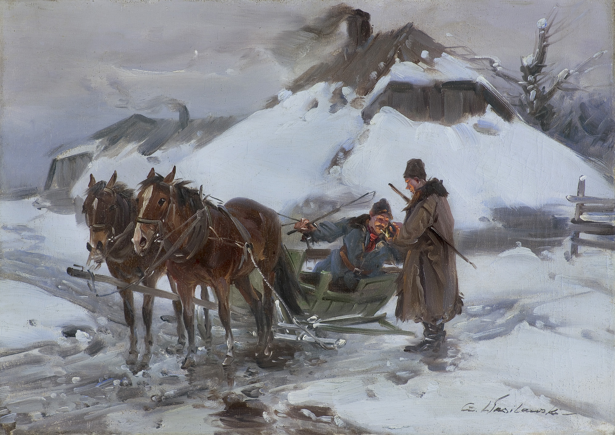 Czesław Wasilewski (ok. 1875 - Warszawa/ Łódź 1946?47) to popularny w okresie międzywojennym warszawski malarz, autor obrazów inspirowanych płótnami Kossaka, Brandta, Chełmońskiego, Wierusza-Kowalskiego czy Fałata. Był samoukiem; wprawdzie w 1911 zapisał się do warszawskiej Szkoły Sztuk Pięknych, ale o jego studiach nic bliższego nie wiadomo. Być może uczęszczał tam (1913-1917) do pracowni Wojciecha Kossaka, dla którego później, na początku lat dwudziestych, przygotowywał podmalówki do obrazów. Uczestniczył w wystawie w Lublinie (1922), wystawiał na Salonach warszawskiej Zachęty (1925,1926, 1927), w Katowicach (1926), Częstochowie (1927), Gdyni (1929), Kaliszu (1931), Poznaniu (1928, 1931). Malował przede wszystkim liczne zaprzęgi, sanny, wyjazdy na polowania, wypadki w podróży, ułanów na patrolu, łosie, sarny i dziki w lesie. Tworzył także nastrojowe pejzaże, wyraźnie inspirowane malarstwem J. Chełmońskiego Rzadziej malował także kwiaty i martwe natury. Utożsamiany z malarzem o nazwisku „Zygmuntowicz”, którego prace pojawiały się na rynku sztuki od trzydziestych lat XX wieku. Stawiany przed tym nazwiskiem inicjał I. lub F., sugerować może imię Ignacy lub Franciszek. Sylwetkę malarza bliżej omówił S. Bołdok w artykule Malarz o dwóch nazwiskach (Art and Business 1992, nr 7-8, s. 48-49).