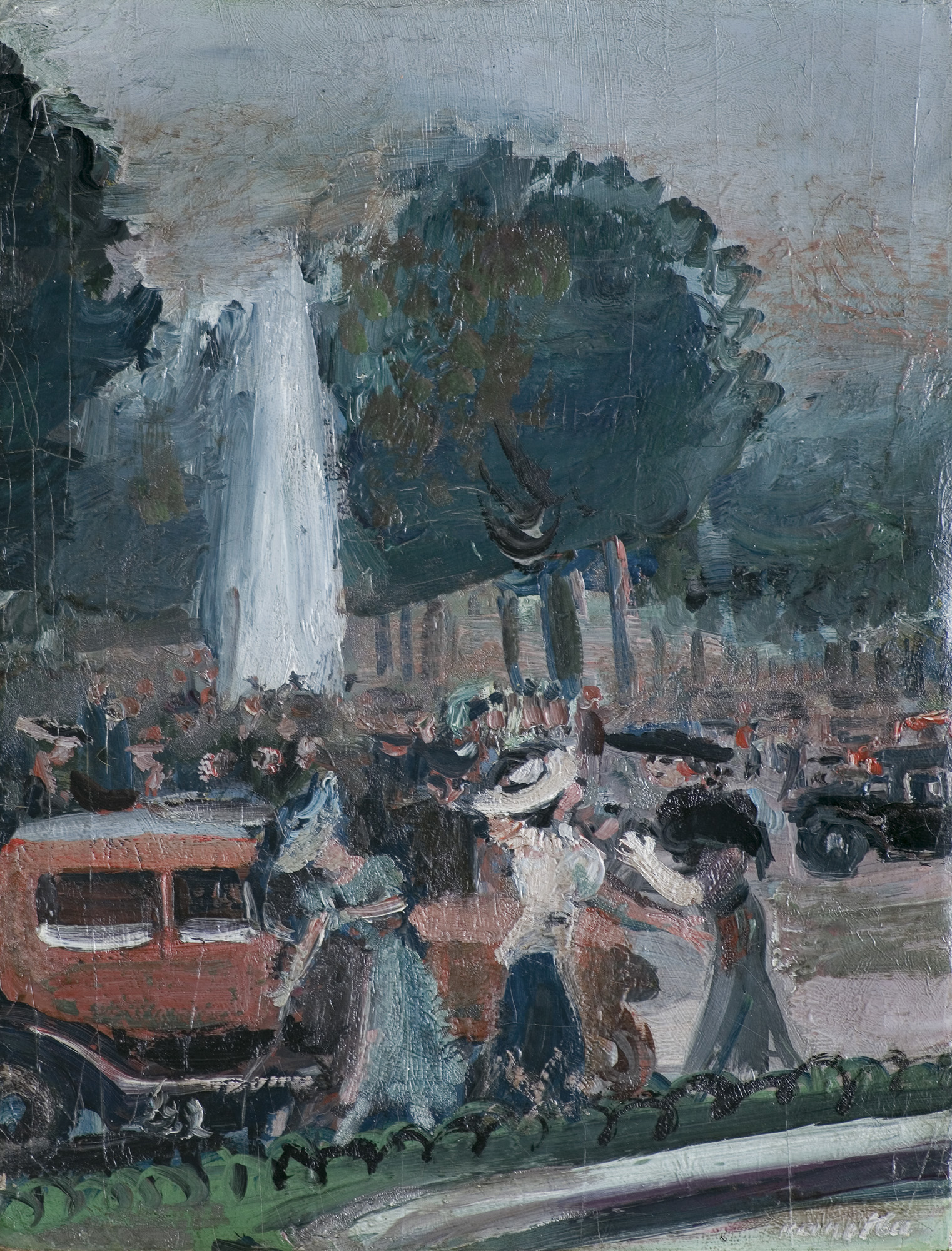 Na odwr. nalepka (tusz): Champs Élysées - oil | by | KANELBA | 106 Chatsworth [Court] | Pembroke Rd. | Lon[don W]8 | price 30 Gns. [cena skreślona]; niżej (tuszem): Rond Point de [sic!] Champs Elysé[es] | by | Kanelba | painted in Paris in 1932; niżej częściowo zdarta nalepka z nr. (czerwonym długopisem): 6[0] [w kółku] | SIXTY; obok (czarnym markerem): 60 [w kółku]; przy d. krawędzi, przeciwnie do kompozycji, nalepka londyńskiej pracowni ramiarskiej James Bourlet ...
