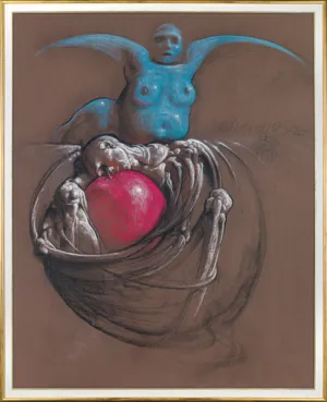 Jak było wspomniane, motywy z Teatru Rysowania pt. W oczekiwaniu Ocaliciela z 1995 roku znajdujemy już w pracy z roku 1981, kiedy Teatr Rysowania zaledwie startował. Świadczy to o charakterystycznej skądinąd dla Franciszka Starowieyskiego trwałości i powrotach - nieraz na przestrzeni całej twórczości - do pewnych ujęć, tematów, form. Podobna postać kobieca ze skrzydłami nielota pojawia się już we wczesnych plakatach. Na oferowanym obrazie ma ona przed sobą ogromne jabłko-jajo w otulinie przypominającej gniazdo uwite z kości - czaszka i kości to również częste w twórczości artysty motywy o wymowie wanitatywnej. Zestawienie tych elementów w jednej kompozycji pozwala sądzić, że mamy tu do czynienia ze swoistą „prefiguracją“ monumentalnego, rozbudowanego treściowo dzieła powstałego 15 lat później.