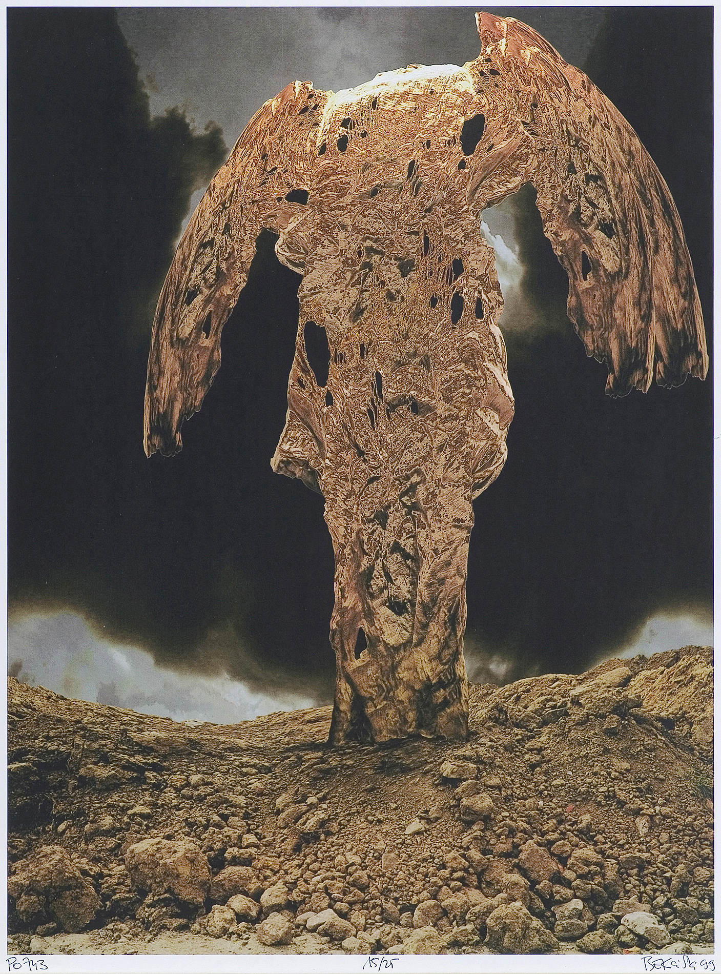 Zdzisław Beksiński (Sanok 24 II 1929 - Warszawa 21 II 2005) studiował w latach 1947-1952 na Wydziale Architektury Politechniki Krakowskiej. Był artystą samoukiem, który osiągnął niekwestionowaną pozycję w polskiej sztuce współczesnej, potwierdzoną obecnością jego prac na prestiżowych wystawach i w kolekcjach muzealnych. Początkowo zajmował się fotografią, którą interesował się od lat studenckich, po 1956 zyskując uznanie jako twórca fotogramów o estetyce opartej o efekty fakturowe. W latach 1958-1962 tworzył abstrakcyjne obrazy-reliefy o bogatej fakturze, głównie metalowe, będące odmianą malarstwa materii. Pod koniec tego okresu powstawały ażurowe formy o kształtach figur i pełnoplastyczne rzeźby w metalu. Kolejnym etapem jego twórczości były lata 1962-1974, kiedy poświęcał się głównie rysunkowi. W latach 60. rysował piórkiem i tuszem figuralne kompozycje odznaczające się karykaturalną deformacją postaci. Od końca lat 60. tworzył rysunki węglem i kredkami, będące monochromatyczną odmianą jego równoległej twórczości malarskiej. Od 1974 zajmował się niemal niepodzielnie malarstwem. Jego charakterystyczny styl bazował na perfekcji technicznej, której towarzyszyła niezwykłość wizji. Malował świat po katastrofie, naznaczony piętnem śmierci i rozpadu. Jego obrazy zaludniają postaci i stwory o ludzkich wprawdzie bądź zwierzęcych kształtach, lecz o cechach fantomów, automatów lub rozpadających się trucheł. Artysta nie nadawał swym obrazom i rysunkom tytułów (poza porządkującymi symbolami), akcentując w ten sposób swój brak zainteresowania dla literackiej strony przedstawień. Sam mówił, że malując całkowicie poddaje się wizji, „fotografuje“ ją. W ostatnich latach włączył do swego warsztatu artystycznego elektroniczne techniki generowania obrazu, które wykorzystywał do tworzenia komputerowych fotomontaży. Sztuka Beksińskiego, wielokrotnie wystawiana i omawiana, budzi skrajne emocje wśród znawców i publiczności.