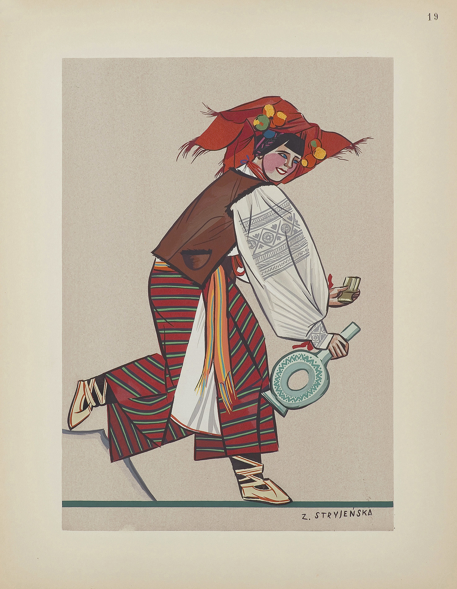 Zofia Stryjeńska, z domu Lubańska (Kraków 1891 - Genewa 1976) - malarka, ilustratorka, scenograf - była jedną z barwniejszych postaci polskiego środowiska artystycznego w dwudziestoleciu międzywojennym. Po krótkim okresie nauki u Leonarda Stroynowskiego i w krakowskiej szkole Marii Niedzielskiej wyjechała do Monachium, gdzie w latach 1911-1912 w męskim przebraniu studiowała w Akademii Sztuk Pięknych (kobiet wówczas na studia nie przyjmowano). Debiutowała w krakowskim TPSP w roku 1912 cyklem kartonów Polskich bajd inspirowanych opowieściami ludowymi. W 1916 wyszła za mąż za Karola Stryjeńskiego. Do 1919 mieszkała w Krakowie, później w Paryżu, Krakowie, Zakopanem i Warszawie. W roku 1925 odniosła międzynarodowy sukces na Wystawie Sztuki Dekoracyjnej w Paryżu, otrzymując Gran Prix w czterech działach (malarstwo, plakat, tkanina, ilustracja) oraz Diplom d’Honneur za projekty zabawek. Zajmowała się dekoracyjnym malarstwem architektonicznym, polichromią, ilustratorstwem, scenografią (m.in. Harnasie Karola Szymanowskiego; 1938), wzornictwem przemysłowym (projekty kilimów, zabawek). Stworzyła własny specyficzny styl w dekoracyjnie stylizowanych, barwnych, pełnych dynamiki i temperamentu obrazach; temperach, akwarelach i gwaszach. W ich tematyce odwoływała się do legend, wierzeń, historii i obyczajowości ludowej. Wydała kilka tek graficznych (Bożki słowiańskie, 1917 i 1922) i albumów reprodukcji (Tańce polskie, 1927; Pascha, 1929; Piastowie, 1929; Gusła Słowian / Magie Slave, 1934). Jej prace popularyzowane były także przez liczne barwne pocztówki.