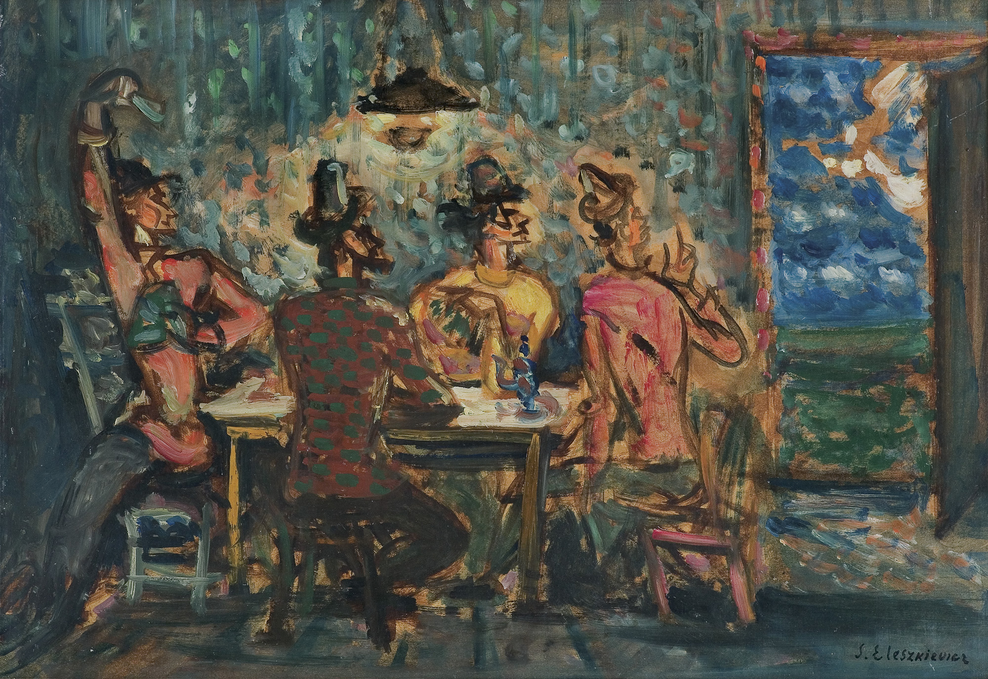 Stanisław Eleszkiewicz (Czutowo k. Połtawy 1900 - Paryż 1963) - malarz, rysownik, projektant mozajek i witraży - od roku 1914 uczył się w Szkole Sztuk Pięknych w Mirgorodzie. W 1918 wstąpił do wojska, a ciężko ranny przez pół roku przebywał w szpitalu. W latach 1919-1921 studiował w Szkole Sztuk Pięknych w Atenach. Następnie był w Neapolu i w Rzymie, a w roku 1923 zamieszkał na stałe w Paryżu i wielokrotnie wystawiał w paryskich galeriach. Malował olejno, gwaszem i temperą, chętnie używał też pasteli. Tworzył ekspresyjne sceny rodzajowe, portrety i pejzaże. Wiele prac artysty znajduje się w zbiorach prywatnych w Paryżu i w Stanach Zjednoczonych.