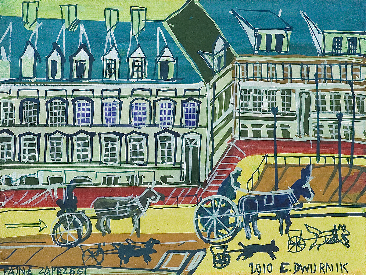 Edward Dwurnik (Radzymin 19 IV 1943 - Warszawa 28 X 2018) studiował malarstwo w ASP w Warszawie (1963-1970), jednak jako swego „mistrza“ wymienia Nikifora. Jego to prace, zobaczone po raz pierwszy w 1965, zainspirowały ówczesnego studenta III roku do narysowania pierwszych prac z cyklu „Podróże autostopem“, które kontynuował w nastepnych latach. W 1972-1978 powstawał cykl „Sportowcy“, w którym portretowane były, dodajmy - kąśliwie, typowe postaci z lat 70. Równolegle od 1975 powstawał cykl „Robotnicy“, który kulminował w okresie „Solidarności“ 1980-1981. Za prace z tego cyklu Dwurnik otrzymał w 1981 Nagrodę Krytyki Artystycznej im. Cypriana Kamila Norwida, natomiast za obrazy z cyklu „Warszawa“ (1981), proroczo zapowiadające stan wojenny - Nagrodę Kulturalną „Solidarności“ podziemnej w 1983. W latach 80. malarstwo Dwurnika przybrało wyraz ekspresyjny i dramatyczny. Powstające w tej dekadzie obrazy miały niejednokrotnie wymowę polityczną, przybierały też kostium historyczny, tak czy inaczej odnoszący się do współczesnych spraw i realiów. Cykl „Droga na Wschód“ (1989-91) upamiętniał ofiary stalinizmu, natomiast cykl „Od Grudnia do Czerwca“ (1990-94) - ofiary stanu wojennego. Zarówno ideowe, jak i czysto malarskie walory tych prac przyniosły artyście ogromne uznanie, zarówno w kraju jak i za granicą. Jego wyrazem była prestiżowa nagroda Fundacji Coutts & Co w Zurychu (1992). W latach 90. powstają cykle będące kontynuacją „Podróży autostopem“: „Niebieskie miasta“ (od 1993) i „Diagonale“ (od 1996), jak również kompozycje nowego typu, jak widoki morskie (cykl „Błękitne“, 1992-93) czy cykl „Wyliczanka“ (1996-99). Artysta wiele wystawia, miał ok. 100 wystaw indywidualnych w Polsce i za granicą, brał też udział w licznych wystawach i festiwalach krajowych i międzynarodowych, m.in.: X Biennale Sztuki Współczesnej, Menton 1974, Documenta 7, Kassel 1982, 5th Biennale, Sydney 1985, XIX Biennale Sztuki, Sao Paulo 1987; Olimpiada Sztuki, Seul 1988. Równolegle z malarstwem uprawiał rysunek, collage, grafikę warsztatową (litografia, techniki metalowe, kserografia, stemple) i użytkową (ilustracja, plakaty do własnych wystaw indywidualnych).