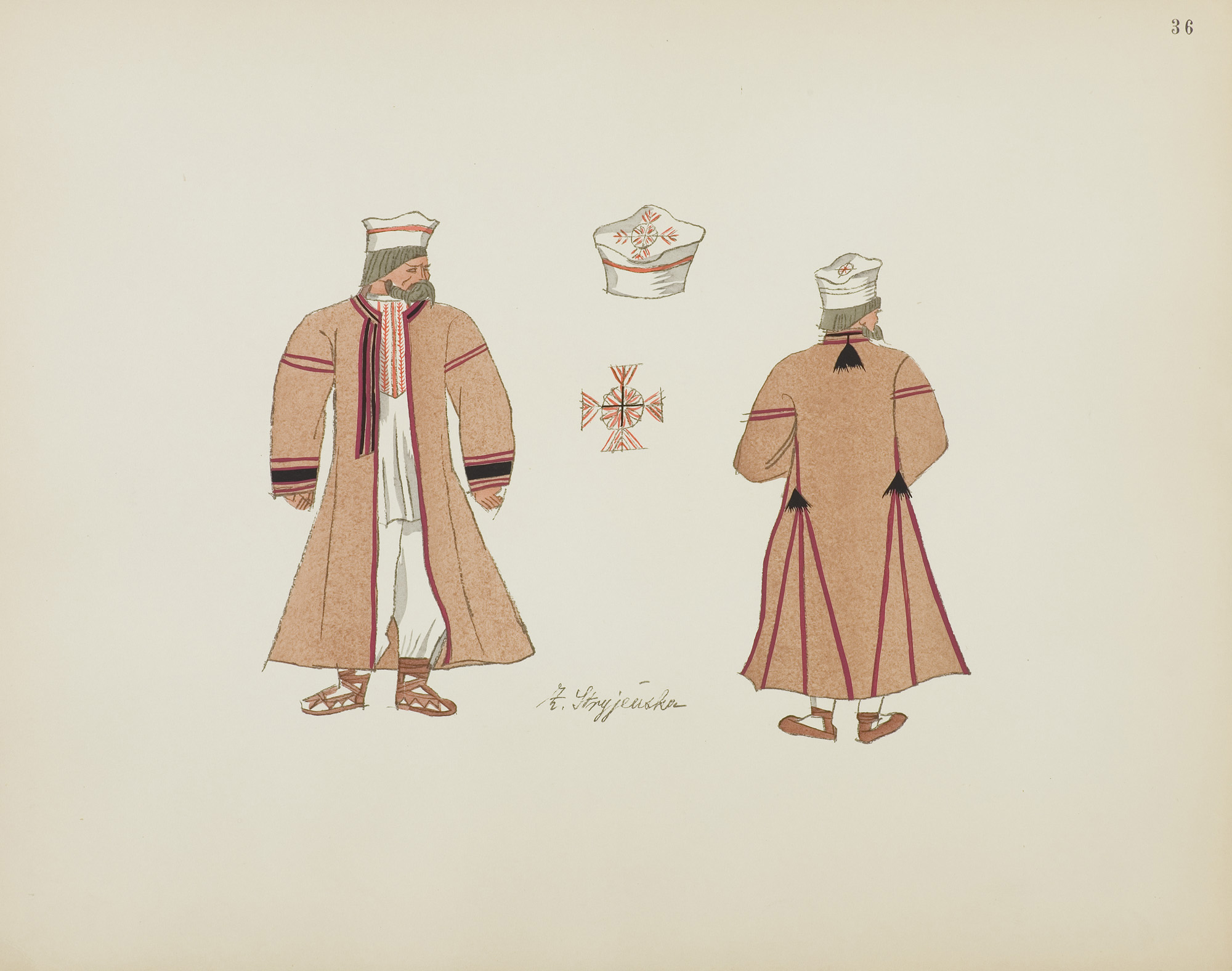 Zofia Stryjeńska, z domu Lubańska (Kraków 1891 - Genewa 1976) - malarka, ilustratorka, scenograf - była jedną z barwniejszych postaci polskiego środowiska artystycznego w dwudziestoleciu międzywojennym. Po krótkim okresie nauki u Leonarda Stroynowskiego i w krakowskiej szkole Marii Niedzielskiej wyjechała do Monachium, gdzie w latach 1911-1912 w męskim przebraniu studiowała w Akademii Sztuk Pięknych (kobiet wówczas na studia nie przyjmowano). Debiutowała w krakowskim TPSP w roku 1912 cyklem kartonów Polskich bajd inspirowanych opowieściami ludowymi. W 1916 wyszła za mąż za Karola Stryjeńskiego. Do 1919 mieszkała w Krakowie, później w Paryżu, Krakowie, Zakopanem i Warszawie. W roku 1925 odniosła międzynarodowy sukces na Wystawie Sztuki Dekoracyjnej w Paryżu, otrzymując Gran Prix w czterech działach (malarstwo, plakat, tkanina, ilustracja) oraz Diplom d’Honneur za projekty zabawek. Zajmowała się dekoracyjnym malarstwem architektonicznym, polichromią, ilustratorstwem, scenografią (m.in. Harnasie Karola Szymanowskiego; 1938), wzornictwem przemysłowym (projekty kilimów, zabawek). Stworzyła własny specyficzny styl w dekoracyjnie stylizowanych, barwnych, pełnych dynamiki i temperamentu obrazach; temperach, akwarelach i gwaszach. W ich tematyce odwoływała się do legend, wierzeń, historii i obyczajowości ludowej. Wydała kilka tek graficznych (Bożki słowiańskie, 1917 i 1922) i albumów reprodukcji (Tańce polskie, 1927; Pascha, 1929; Piastowie, 1929; Gusła Słowian / Magie Slave, 1934). Jej prace popularyzowane były także przez liczne barwne pocztówki.